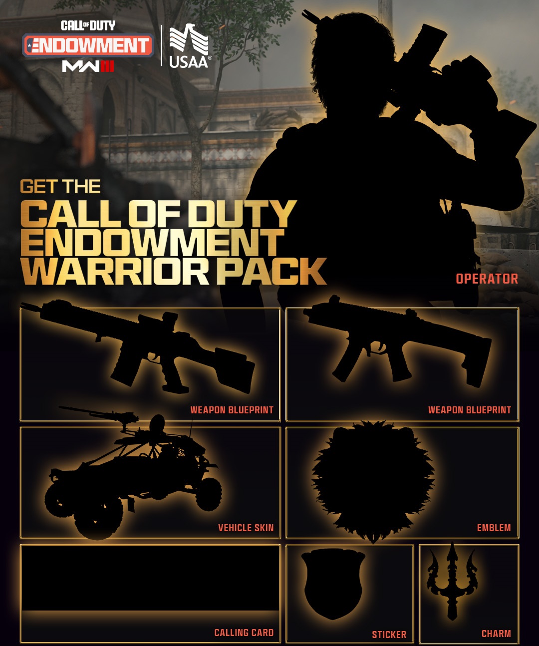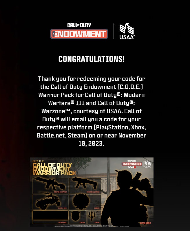 10 ноября 2023 года получатели предварительного заказа получат электронное письмо с уникальным кодом в зависимости от выбранной платформы и инструкциями по его активации для вашего набора Warrior Pack Call of Duty Endowment (C.O.D.E.).