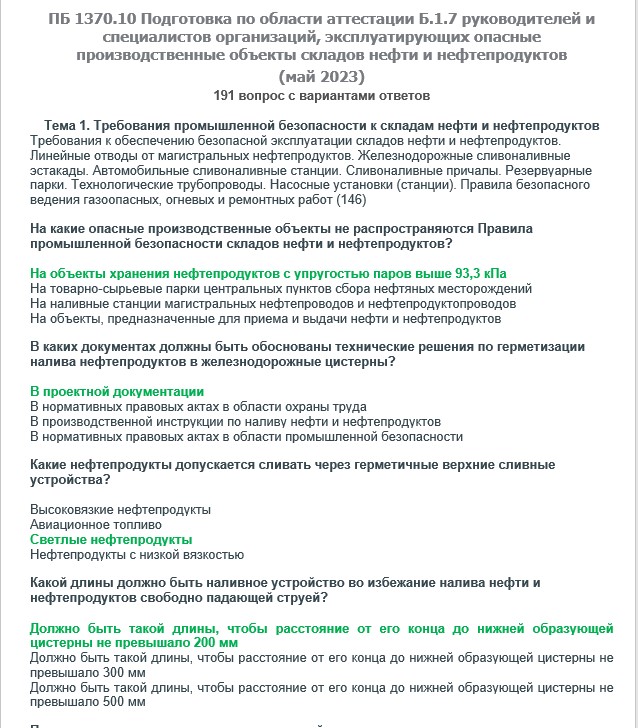 Вопросы с ответами к курсам ОКС-Олимп Б.1.7 ПБ 1370.10 (май 2023) Эксплуатация опасных производственных объектов складов нефти и нефтепродуктов