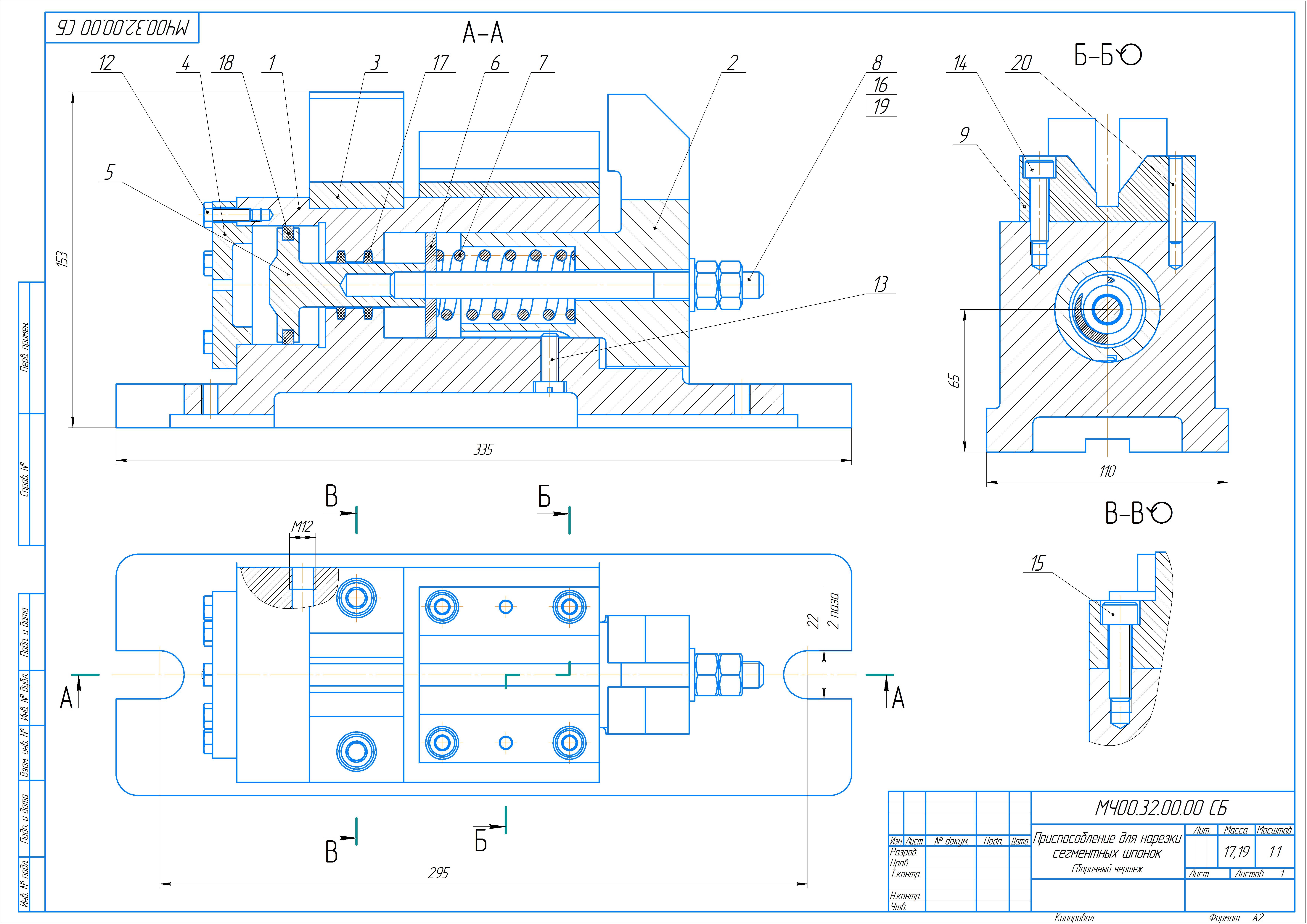 3D-модели, чертежи деталей, сборочный чертеж и спецификация в Компасе v.16 задания из учебника Боголюбова: МЧ00.32.00.00 Приспособление для нарезки сегментных шпонок.
