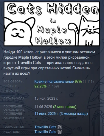 Найди 100 котов, спрятавшихся в уютном осеннем городке Maple Hollow, в этой милой рисованной игре от Travellin Cats — оригинального создателя вирусной игры про спрятанных котов! Сможешь найти их всех?