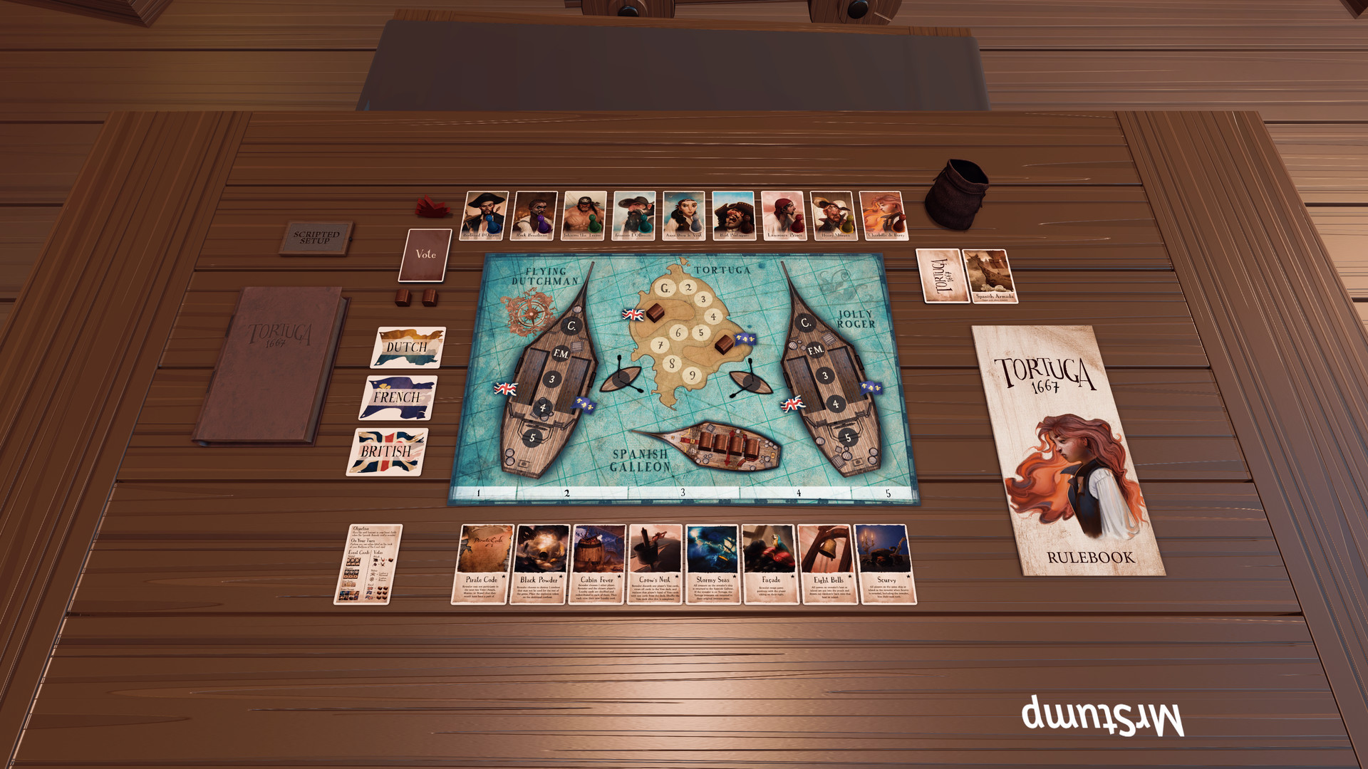 The year is 1667 and you are a pirate sailing the waters of the Caribbean. Captain the high seas, or crew for a stalwart and trustworthy captain. Or throw them overboard. For 2-9 Players. 20-40 minutes to play.