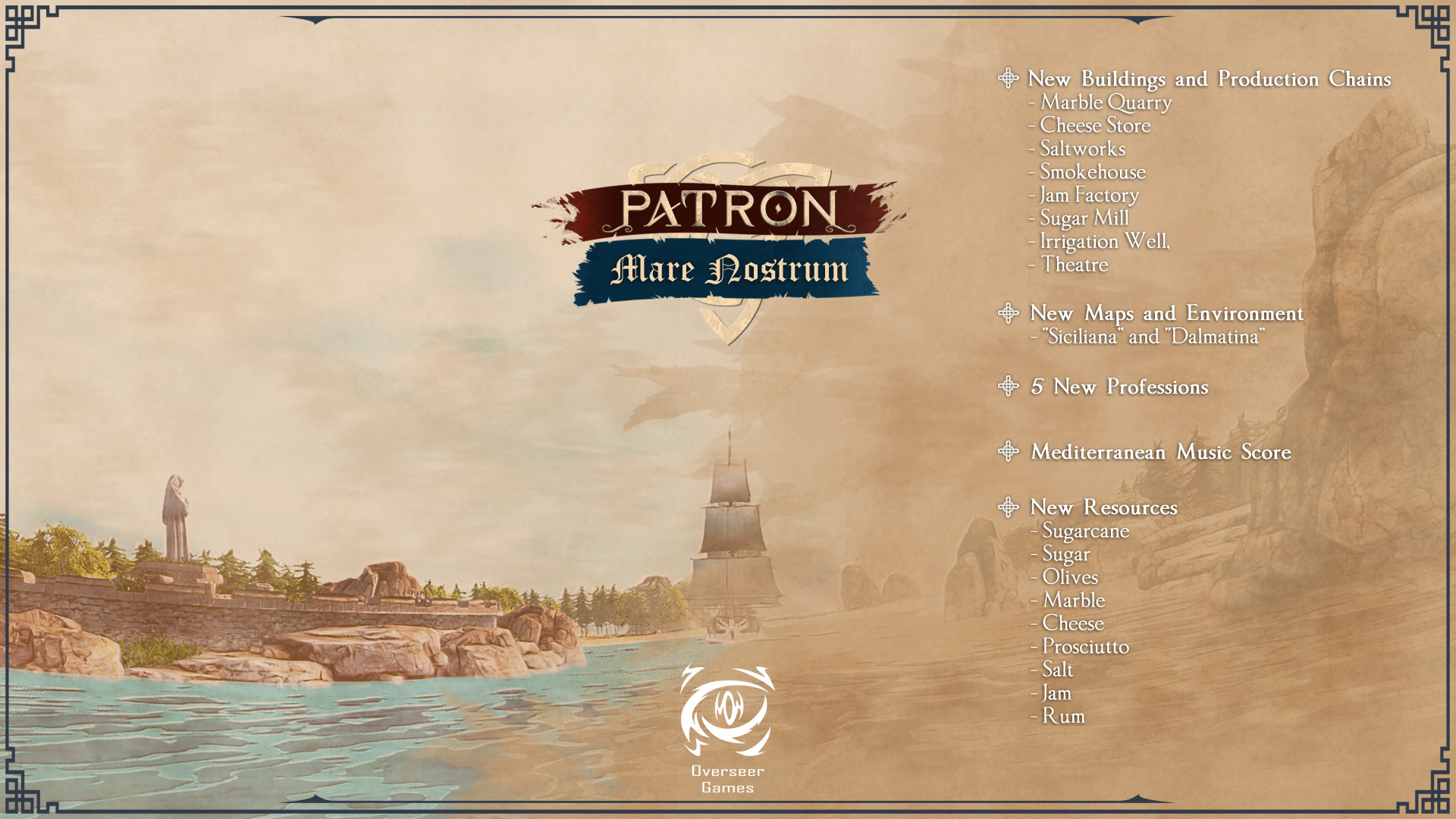 Заселите острова "Mare Nostrum" в совершенно новом дополнении для Patron! Новые карты, здания, ресурсы и производственные цепочки ждут вас. Используйте их для своей процветающей колонии на Средиземном море.