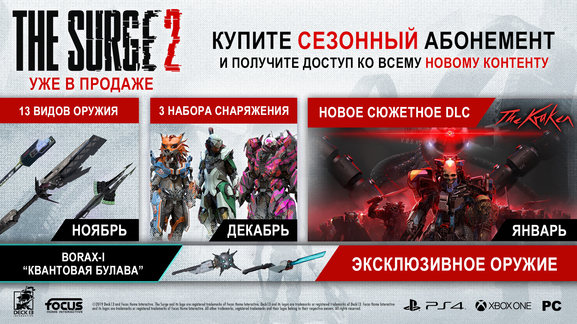 Купите сезонный пропуск, чтобы экономить и первыми загружать данные для игры. С сезонным пропуском вы получите все четыре дополнения к The Surge 2, в том числе одно сюжетное.