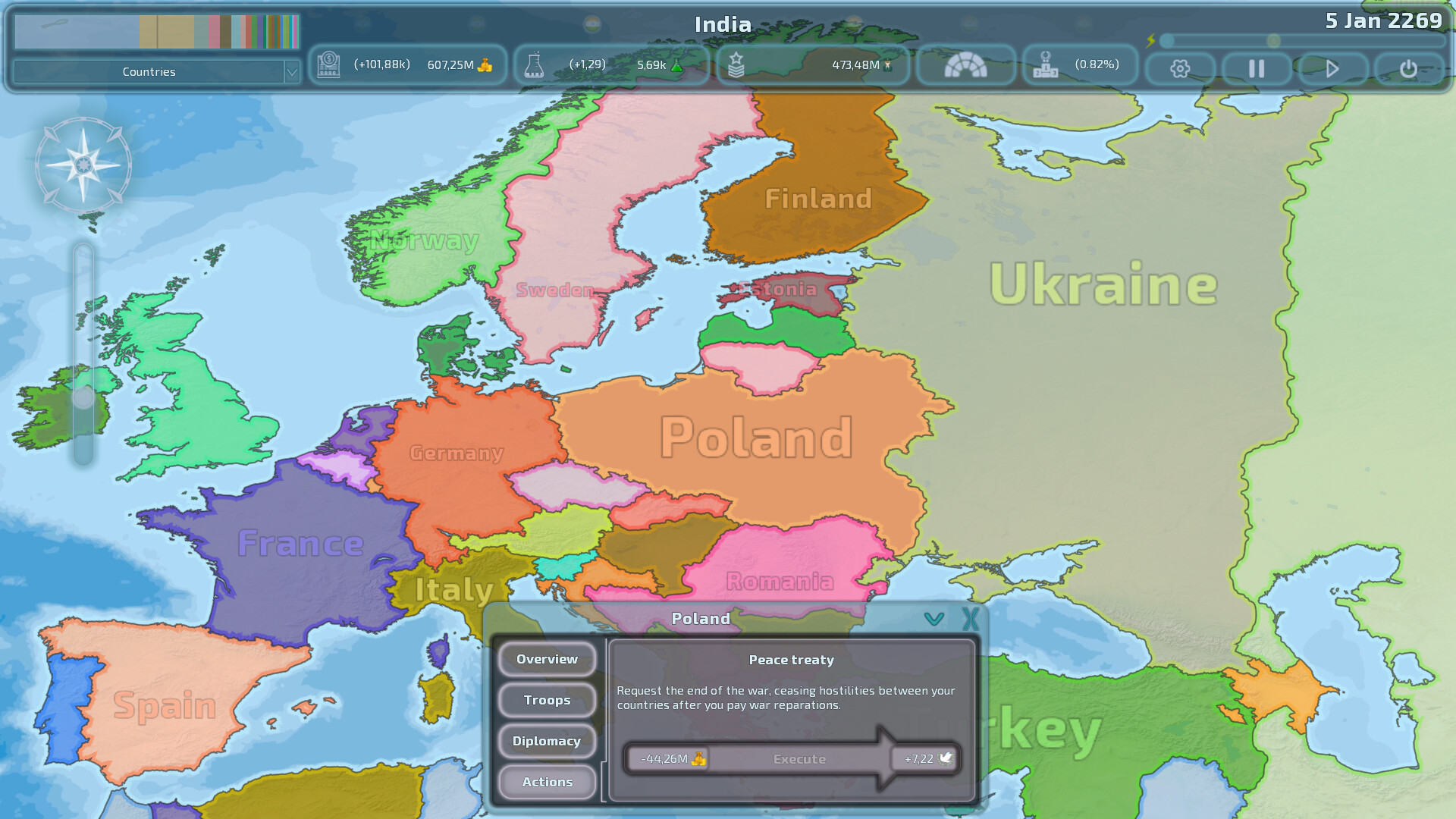 Geopolitical management game with real-time shifting borders and a streamlined gameplay, designed to minimize all burdensome chores while allowing an absolute strategic control, from military recruitment and deployment, to diplomatic and economic management.