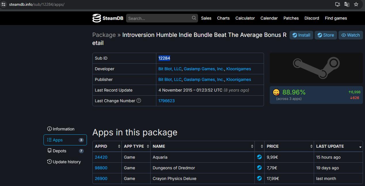 https://steamdb.info/sub/12284/apps Включенные товары (3): Aquaria, Dungeons of Dredmor, Crayon Physics Deluxe