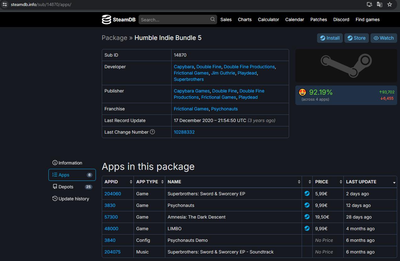 https://steamdb.info/sub/14870/apps Включенные товары (4): Superbrothers: Sword & Sworcery EP, Psychonauts, Amnesia: The Dark Descent, LIMBO