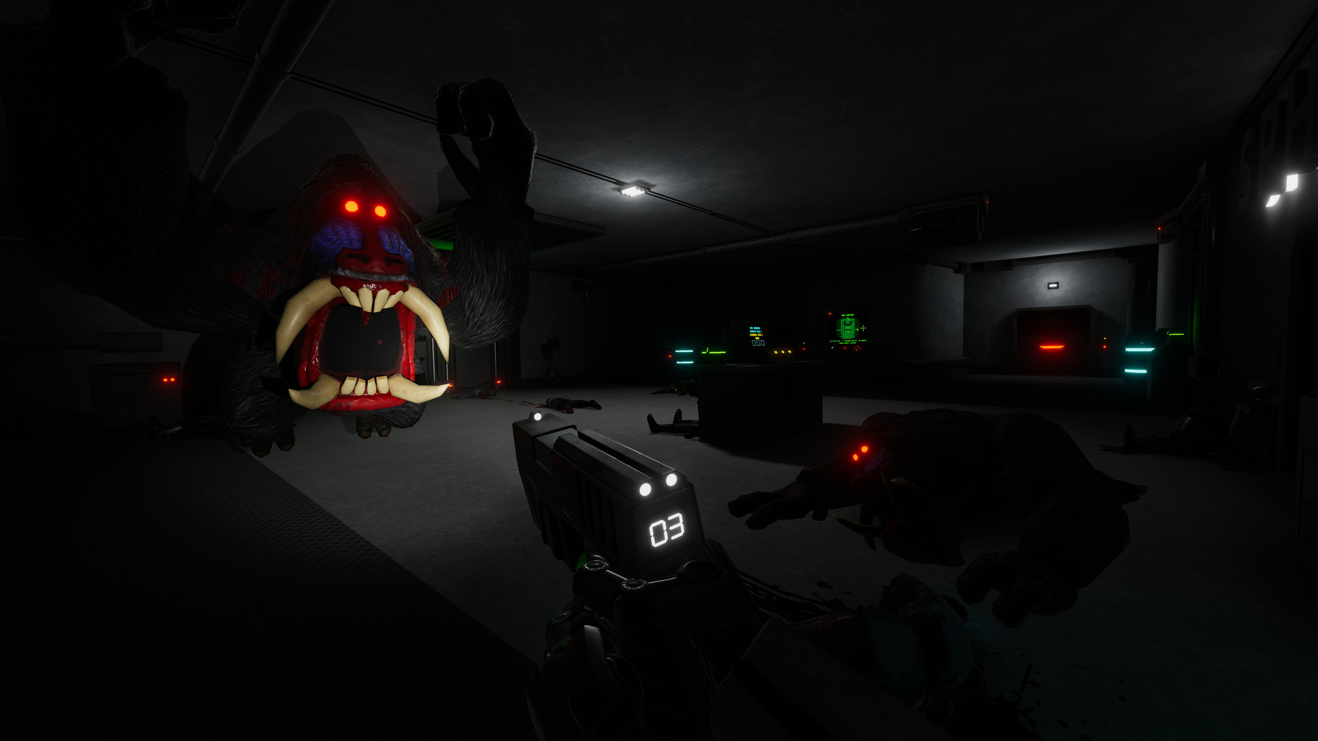 Local VR vs PC horror game: 1 VR player controls a lone robot trying to escape an underground lab; up to 2 PC players control giant alien monkeys. Customize your experience with gameplay modifiers, ranging from tense survival stealth to brutal nonstop action!
