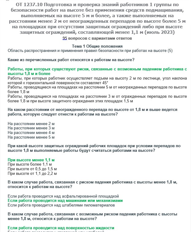 Вопросы с ответами к курсам ОКС-Олимп ОТ 1237.10 (июль 2023) Подготовка и проверка знаний работников 1 группы по безопасности работ на высоте без применения средств подмащивания, выполняемых на высоте 5 м и более, а также выполняемых на расстоянии менее 2 м от неогражденных перепадов по высоте более 5 м на площадках при отсутствии защитных ограждений либо при высоте защитных ограждений, составляющей менее 1,1 м