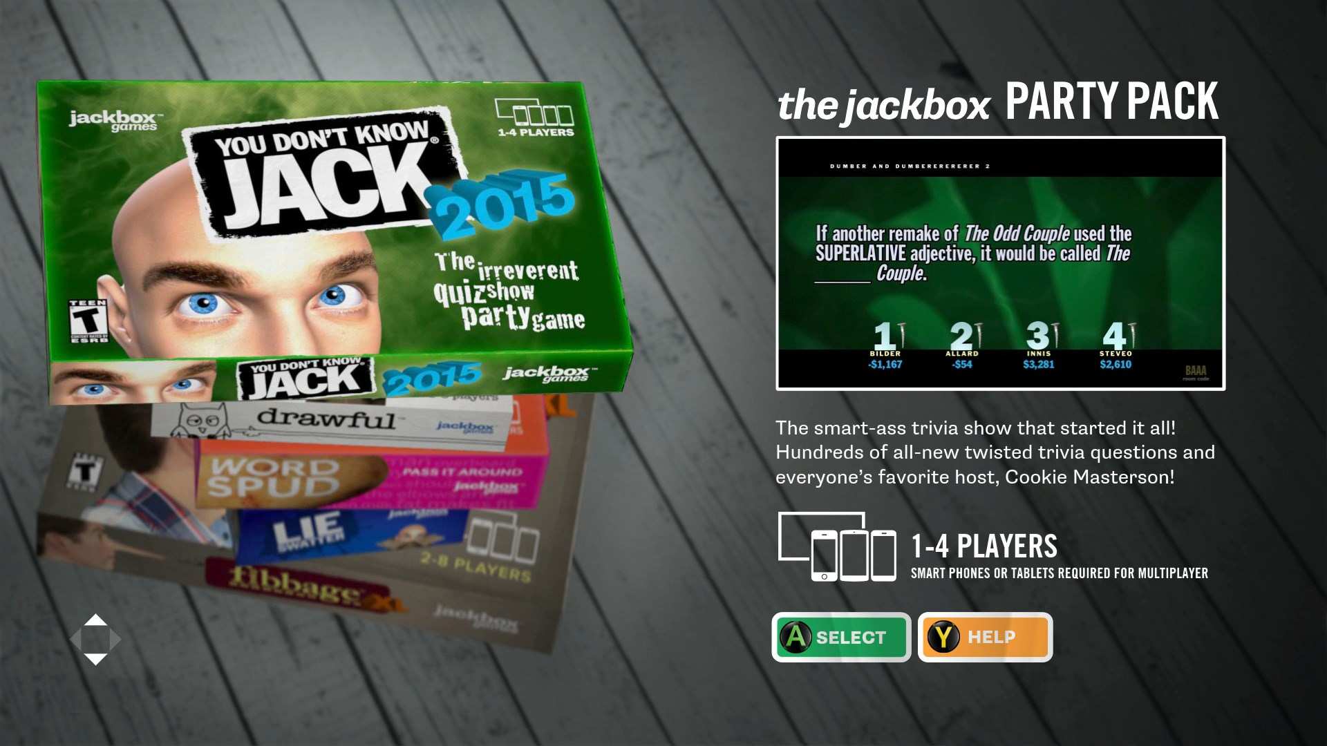 Игроки играют, используя свои телефоны, планшеты или даже компьютеры в качестве контроллеров, что делает эту игру идеальным развлечением для следующего игрового вечера или вечеринки. После запуска игры из встроенного меню игроки просто подключаются к веб-адресу jackbox.tv на своем устройстве, а затем вводят код комнаты на экране, чтобы войти в игру. Никакой большой путаницы с контроллерами не требуется! Для этого вам понадобится более одной группы.
