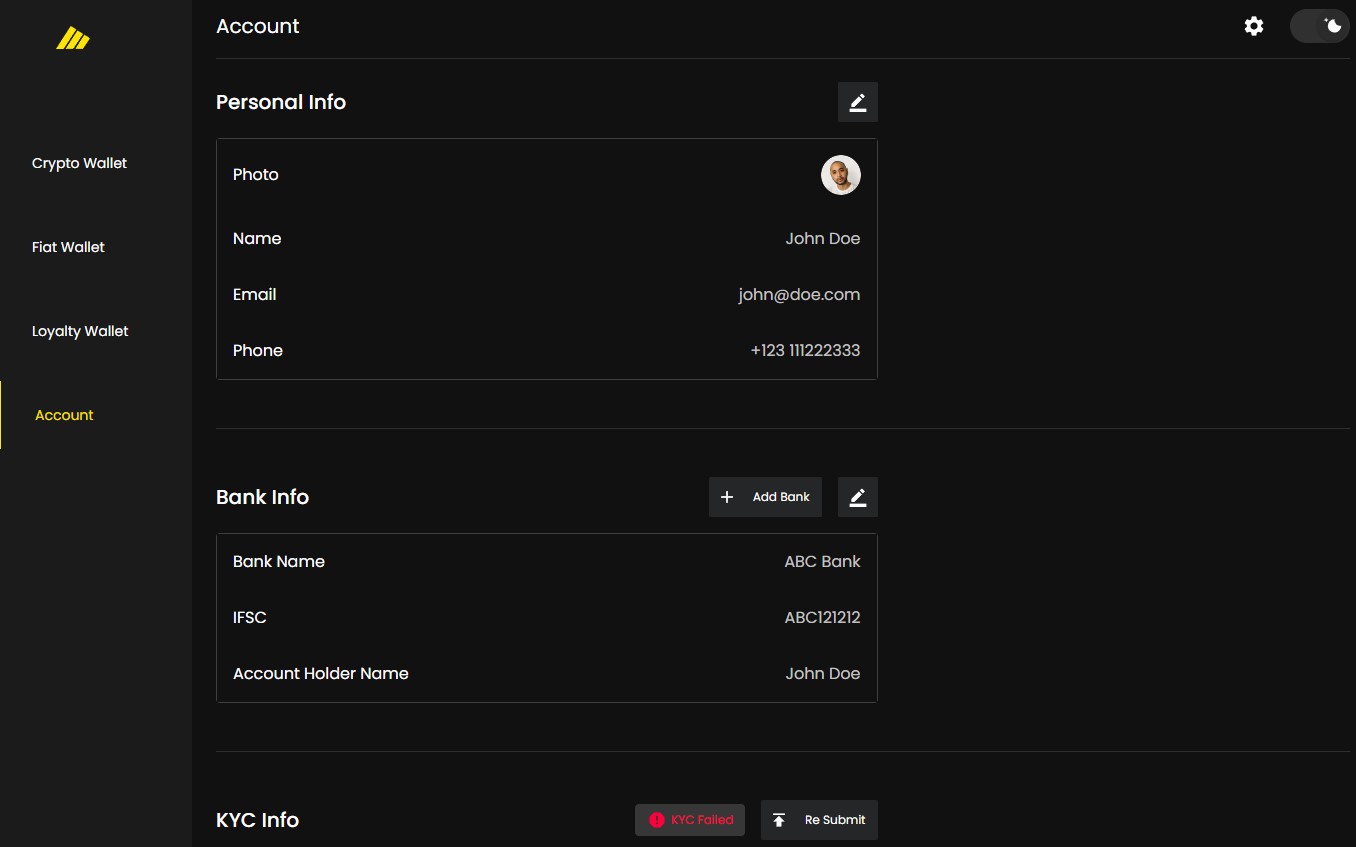 Экран учетной записи для редактирования профиля, редактирования банковского счета, редактирования KYC, изменения пароля и удаления учетной записи.