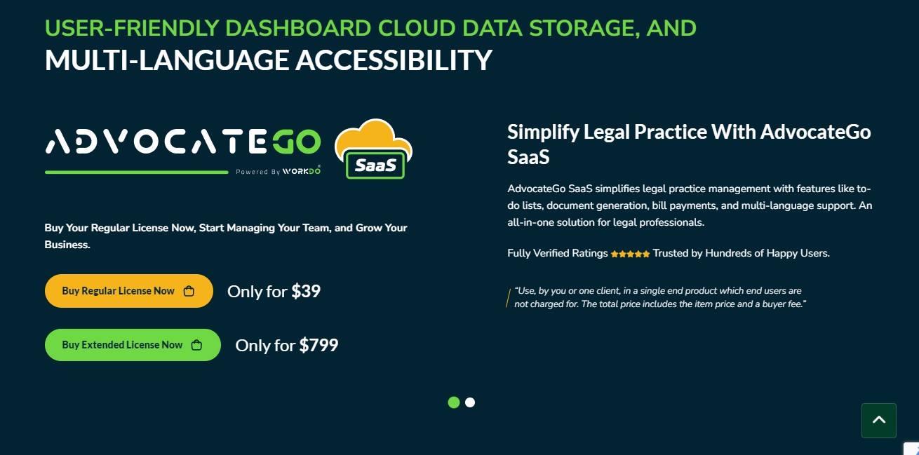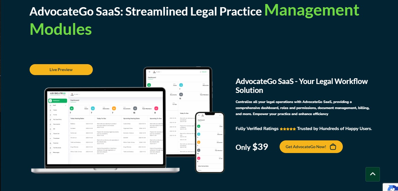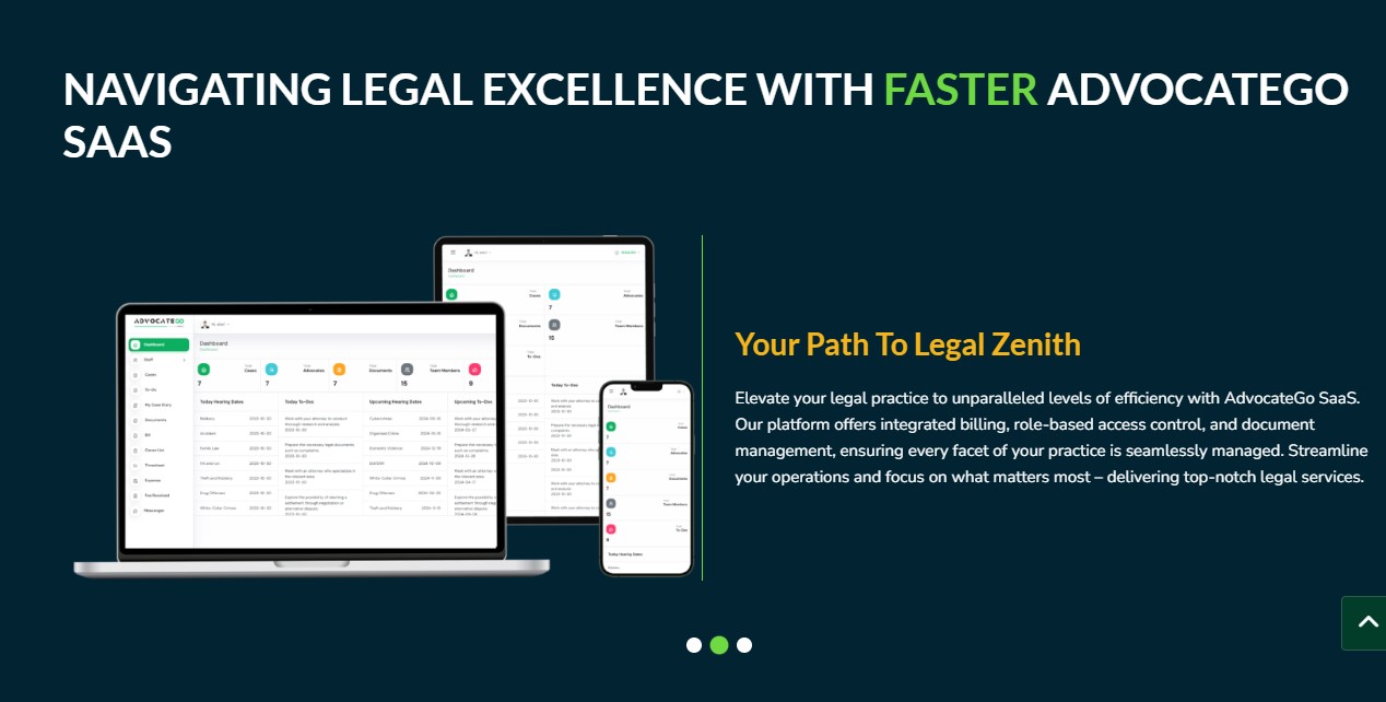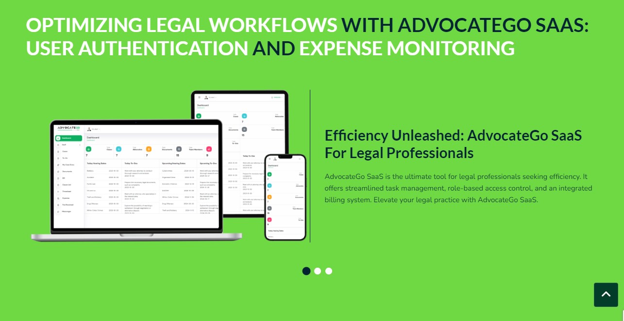 AdocateGo SaaS оптимизирует управление юридической практикой, контролируя задачи юристов, детали дела и обработку платежей. Это способствует бесперебойному сотрудничеству на протяжении всего рабочего процесса, позволяя юристам эффективно управлять каждым аспектом своей практики. С AdvocateGo SaaS вы можете оптимизировать свою деятельность, повысить эффективность и сосредоточиться на предоставлении исключительных юридических услуг своим клиентам. С версией AdvocateGo SaaS вы можете управлять всеми аспектами своего бизнеса с помощью одного инструмента.