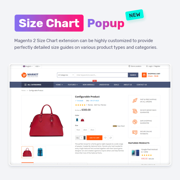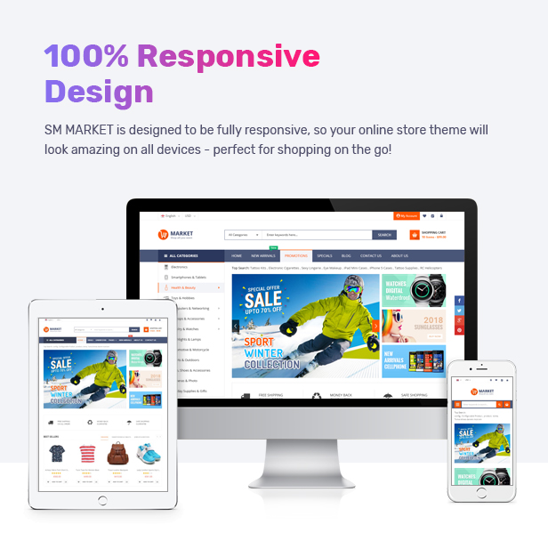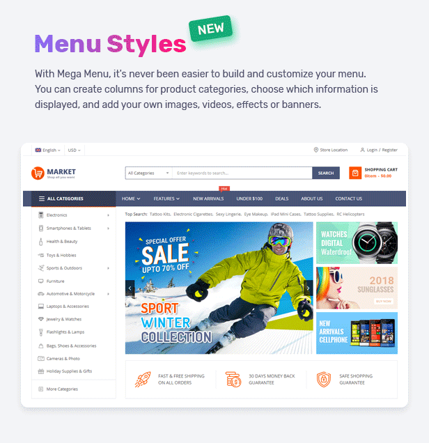 Market — это адаптивная тема Magento 2 и 1.9 , которая полностью настраивается и подходит для интернет-магазинов, особенно для многокатегорийных магазинов с множеством филиалов и продуктов, таких как интернет-магазин, супермаркет, цифровой магазин, магазин высоких технологий, магазин часов, магазин модной одежды, магазин одежды, мебельный магазин, книжный магазин, магазин косметики, магазин роскошных ювелирных изделий и аксессуаров или мега-магазины.