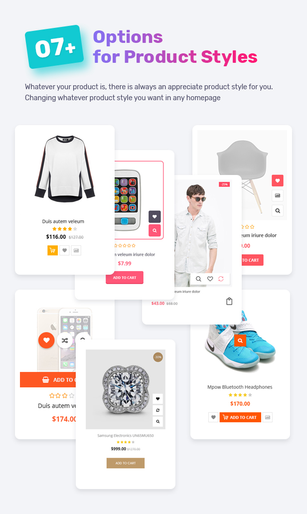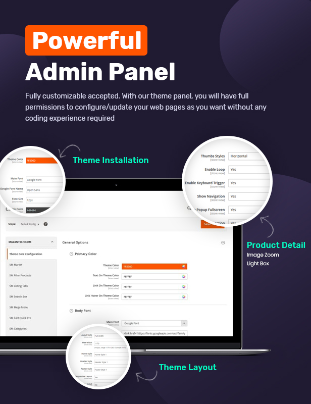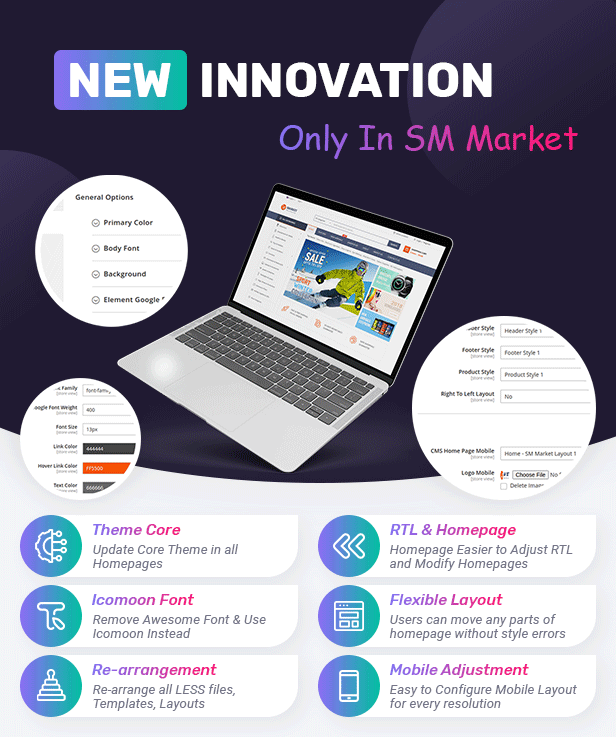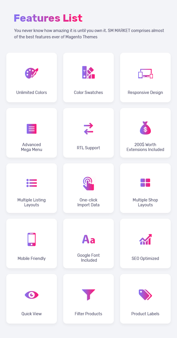 Интеграция со многими расширениями Magento премиум-класса : Вертикальное мегаменю с несколькими столбцами и статическими блоками с красивым изображением, SM Tab Listing показывает продукты каждой категории на каждой вкладке с помощью ползунка. SM «Категории» позволяют отображать множество категорий вместе с отображаемым изображением. Статические блоки с красивыми изображениями и текстом несут полезную информацию о вашем магазине. Многоуровневая навигация ajax, расширение Ajax Cart Pro помогают клиентам совершать покупки быстрее, многоязычность, мультивалютность, эффект наведения продукта и т. д.