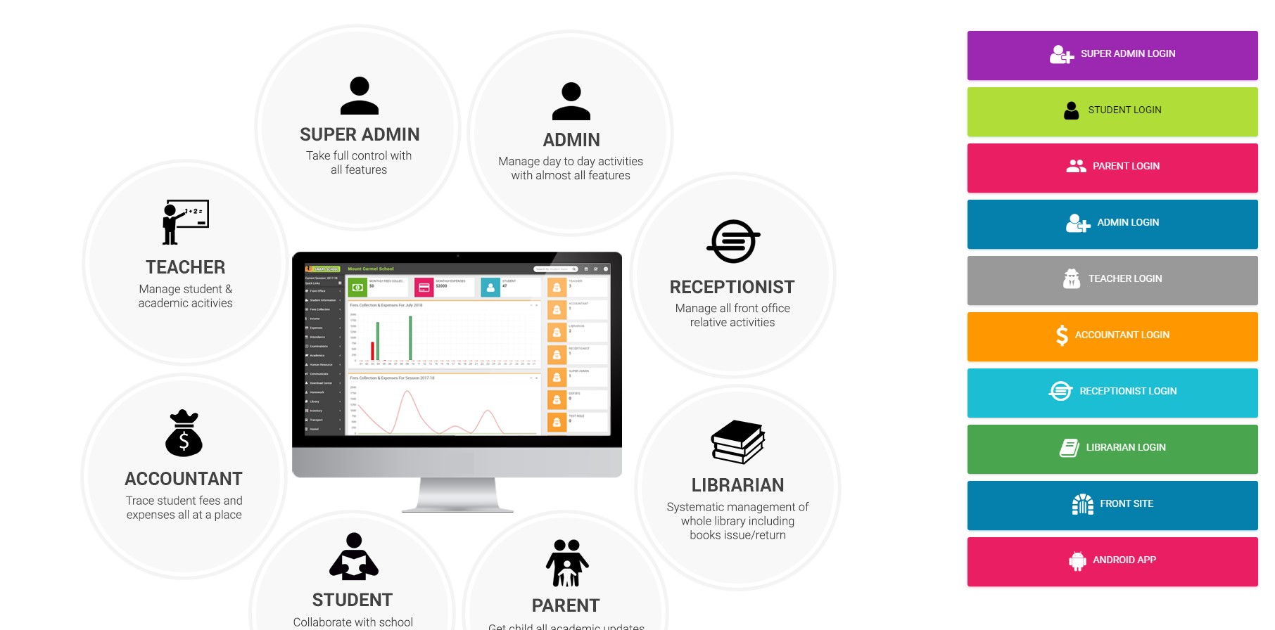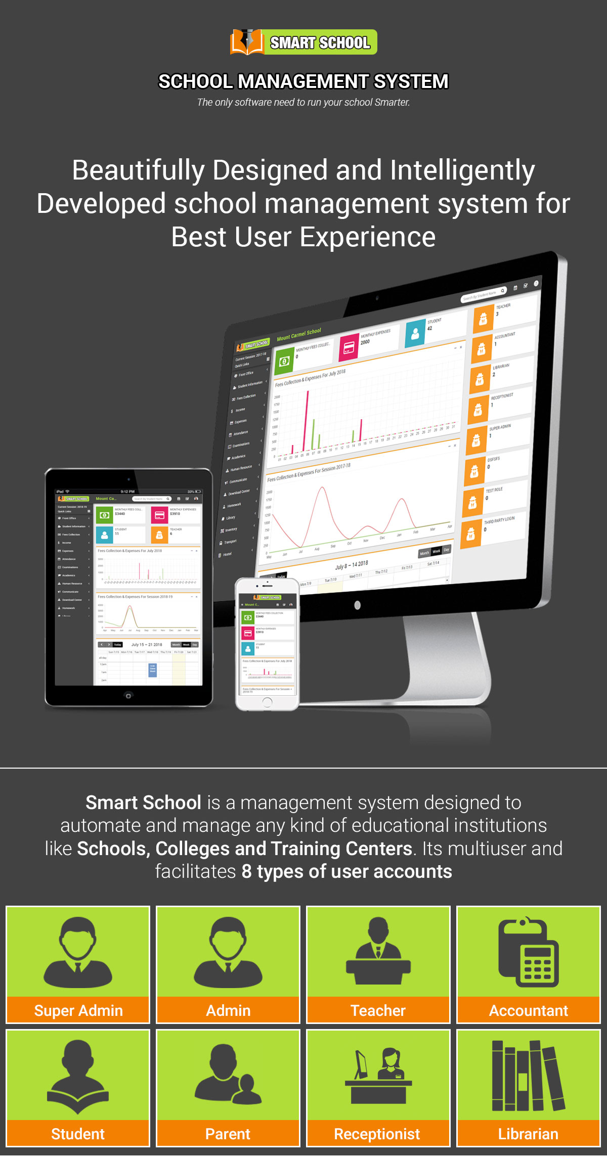Smart School — это современное и полное программное обеспечение для автоматизации школы , которое подходит практически для каждой школы или учебного заведения, от приема учащихся до их отчисления, от сбора платы до результатов экзаменов. Он включает в себя более 30 модулей с 8 встроенными панелями пользователей (суперадминистратор, администратор, бухгалтер, учитель, регистратор, библиотекарь, родитель и ученик).