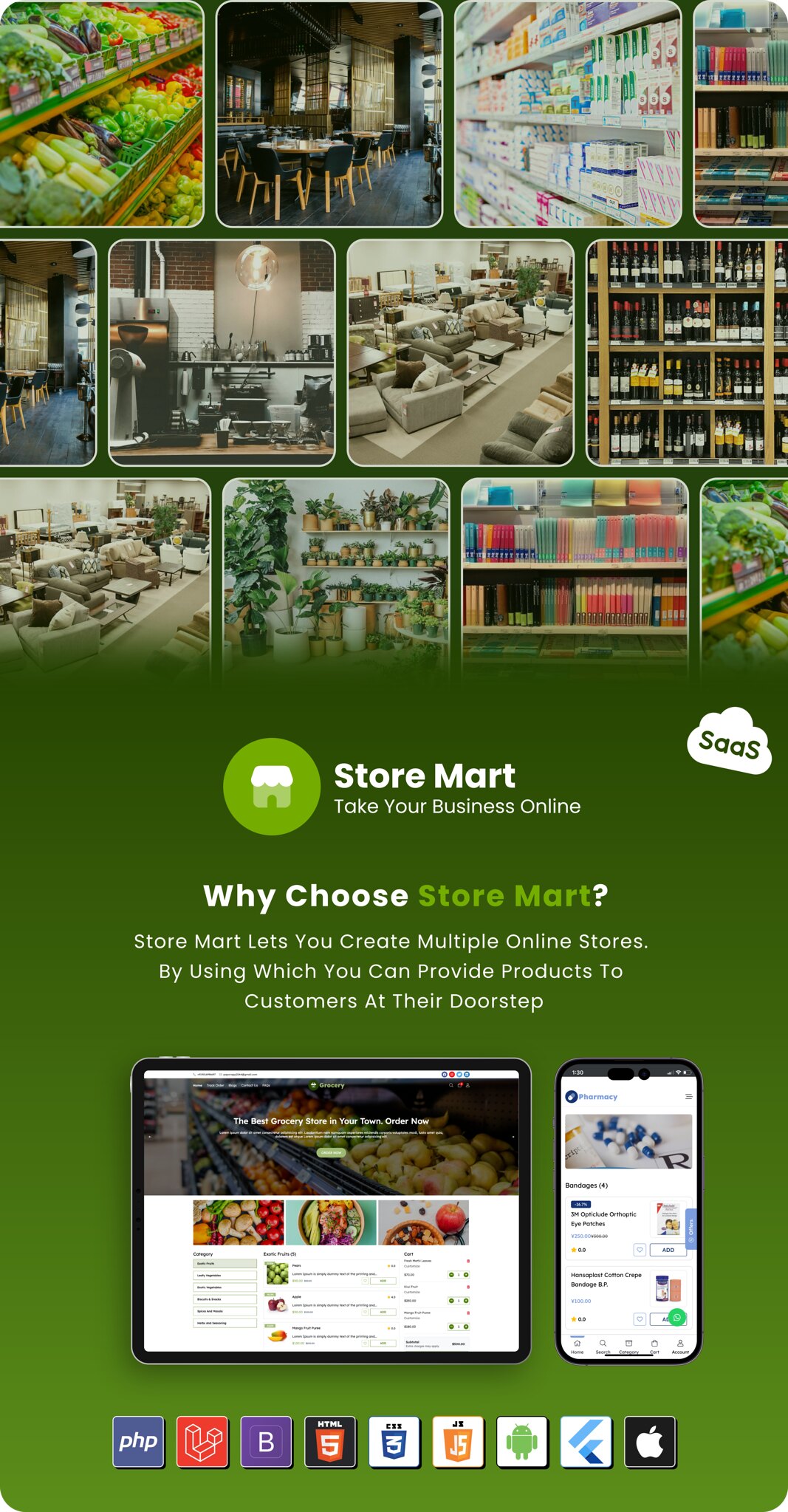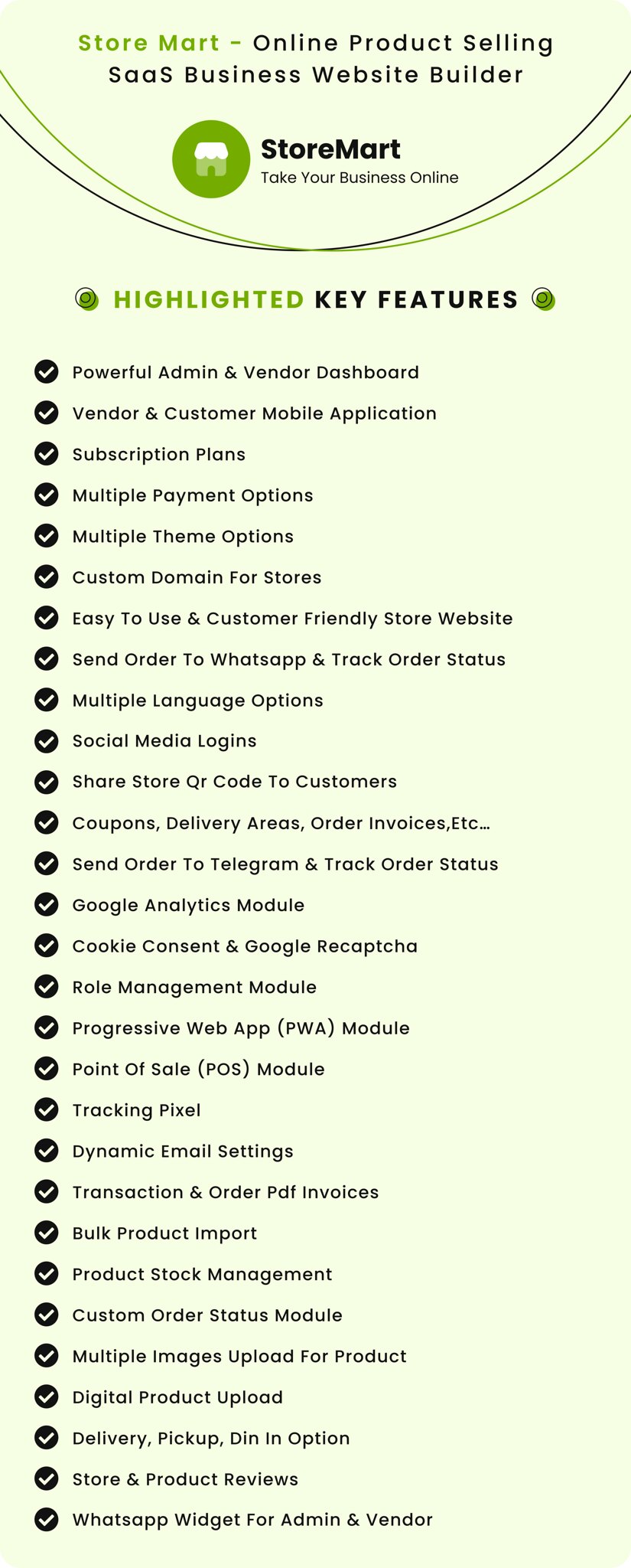 StoreMart SaaS — это комплексная платформа для компаний, желающих создавать и управлять своими веб-сайтами электронной коммерции. Удобный интерфейс и мощные функции делают его идеальным выбором для малого и среднего бизнеса, которые хотят быстро и легко начать онлайн-продажи.