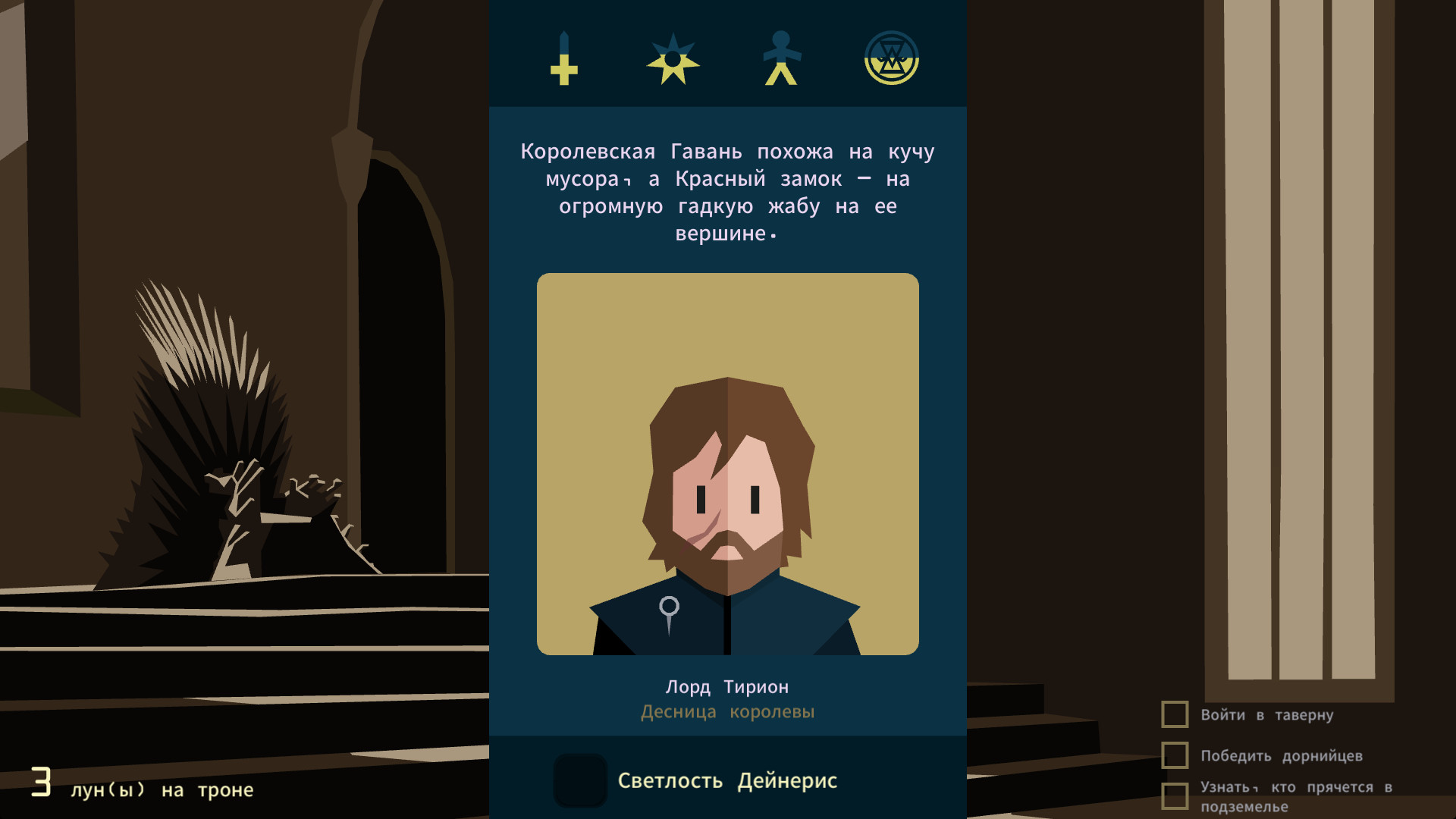 Reigns: Game of Thrones создана на основе знаменитого сериала «Игра престолов®» канала HBO® и хитовой серии игр про принятие решений от Nerial и Devolver Digital.