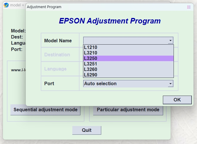 1) Adjustment program Epson L1210 L3210 L3250 L3251 L3260 L5290 - сервисная программа для сброса счетчика абсорбера (памперса) и выполнения других настроек принтера. Поддерживает принтеры Epson, таких моделей как: Epson L1210 L3210 L3250 L3251 L3260 L5290