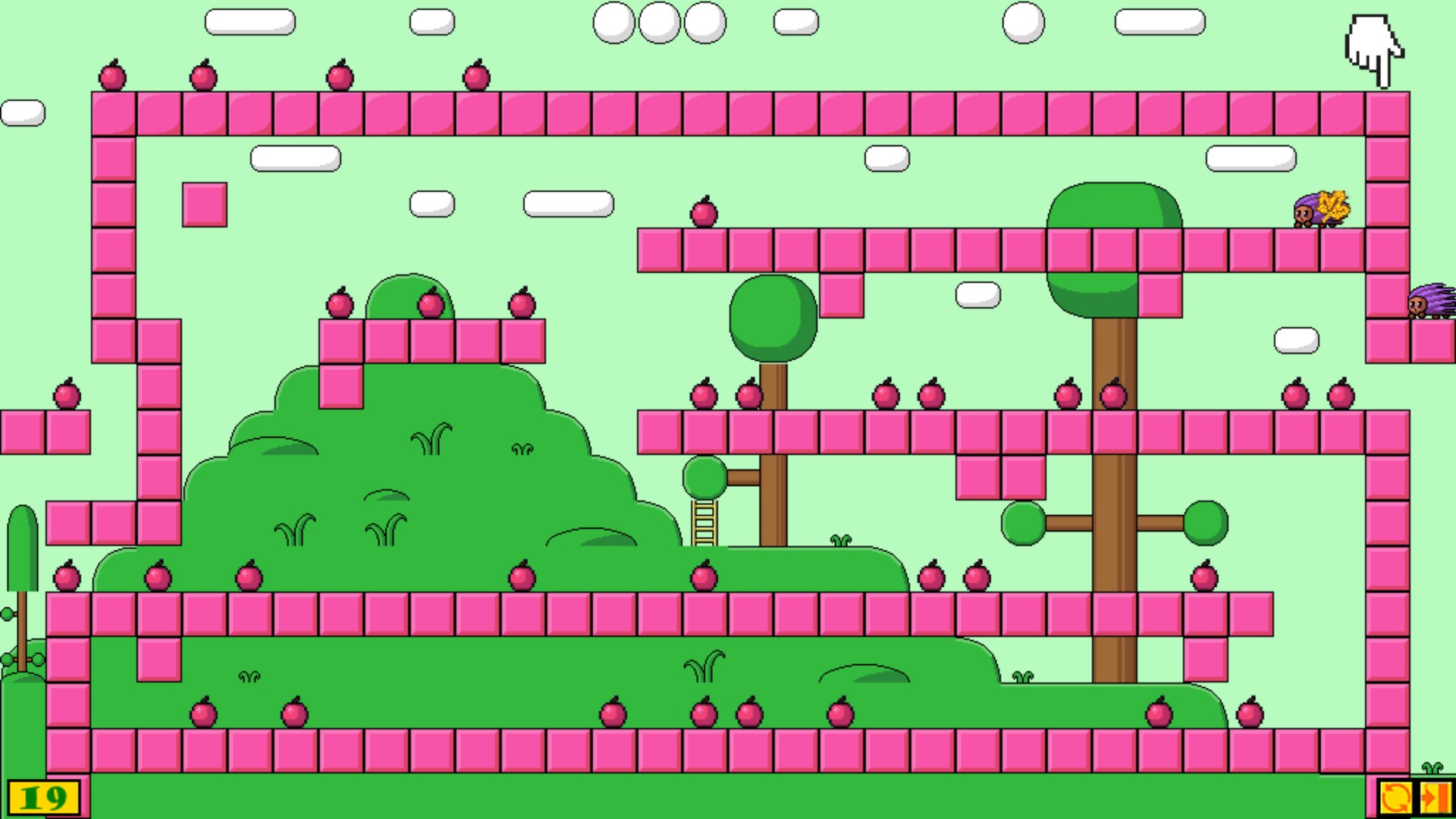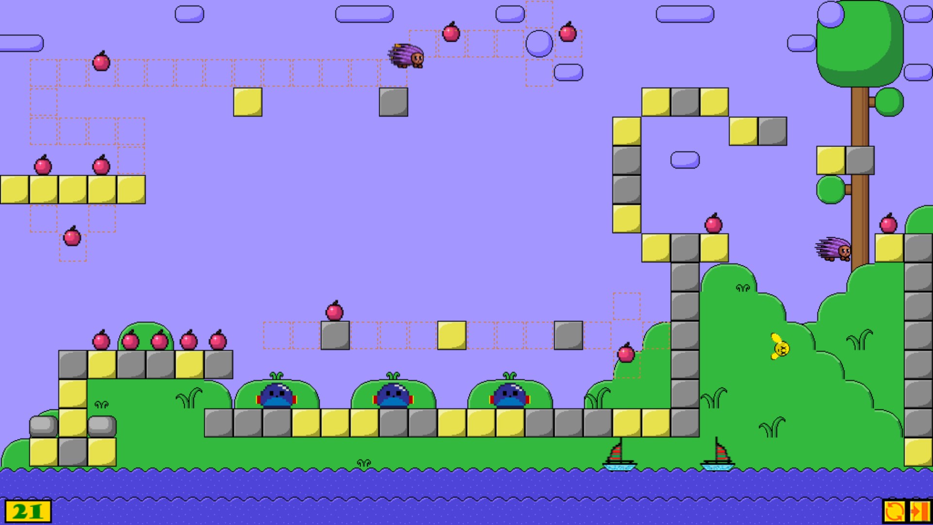 Уровень пройден, когда ежики соберут все яблоки.