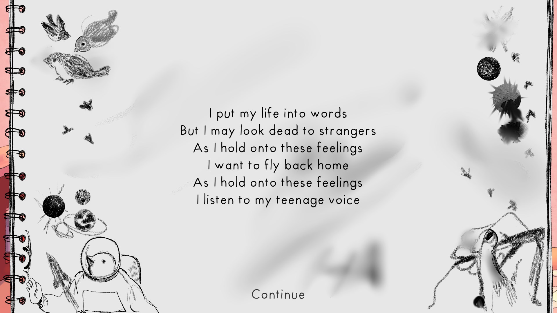 Lose yourself into Lucia’s mindscape, divided between her thoughts, drawings, and music she’s listening to through her journey to re-discover her own self.