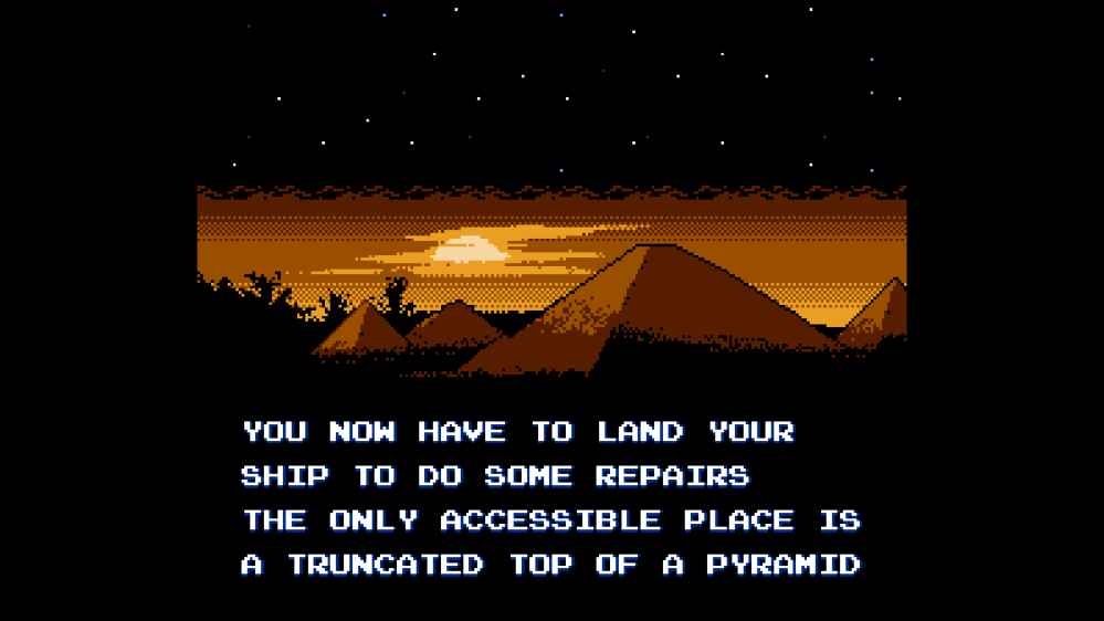 Неисправность вашего корабля вынуждает вас приземлиться в Египте (1300 г. до н.э.), где, к счастью, вы обнаруживаете огромную пирамиду, на которую можете поставить свой корабль. Ну, может быть, вам не так повезло?