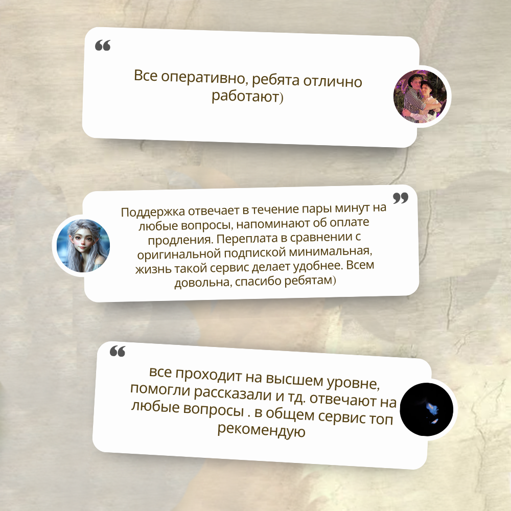 1. Доступ к аккаунту предоставляется на 1/3/6 месяцев в зависимости от выбора параметров. После истечения выбранного срока следует новая оплата. Гарантия действует на все время подписки.
