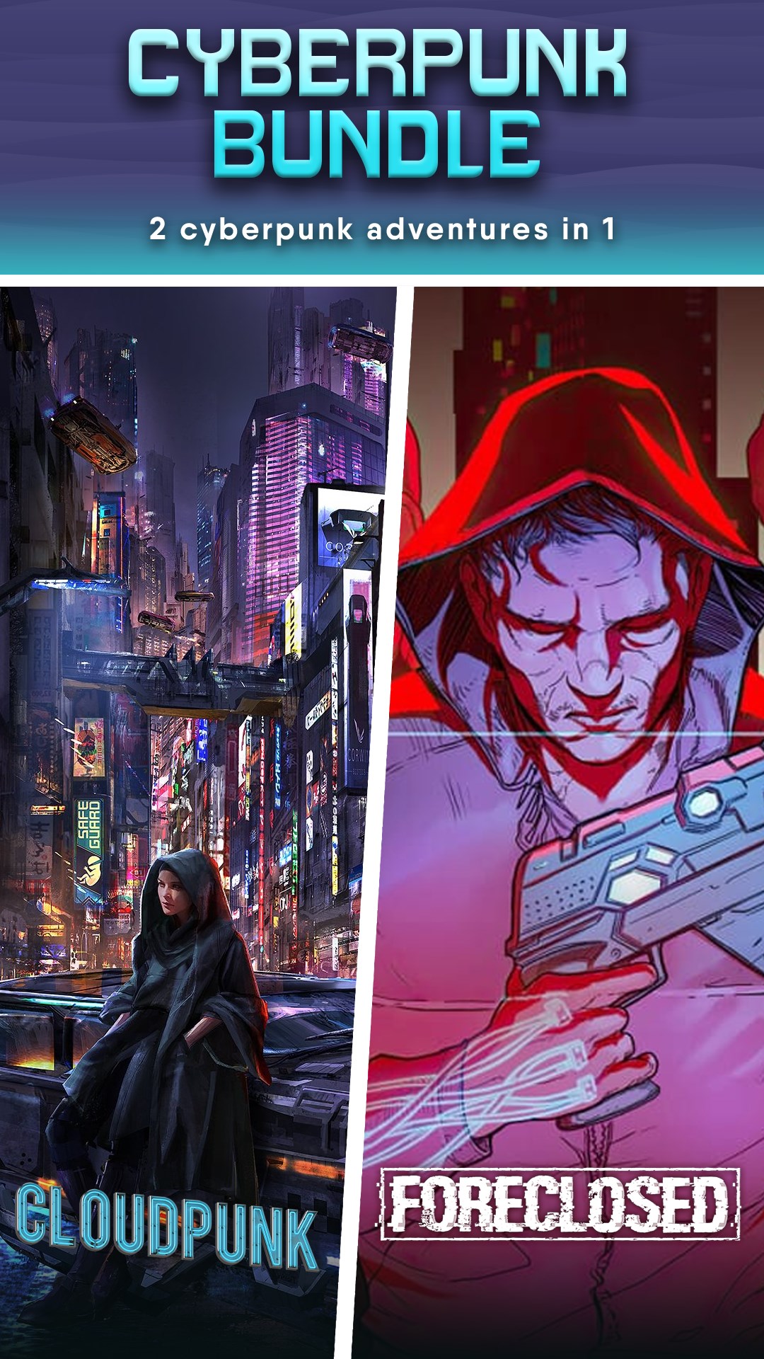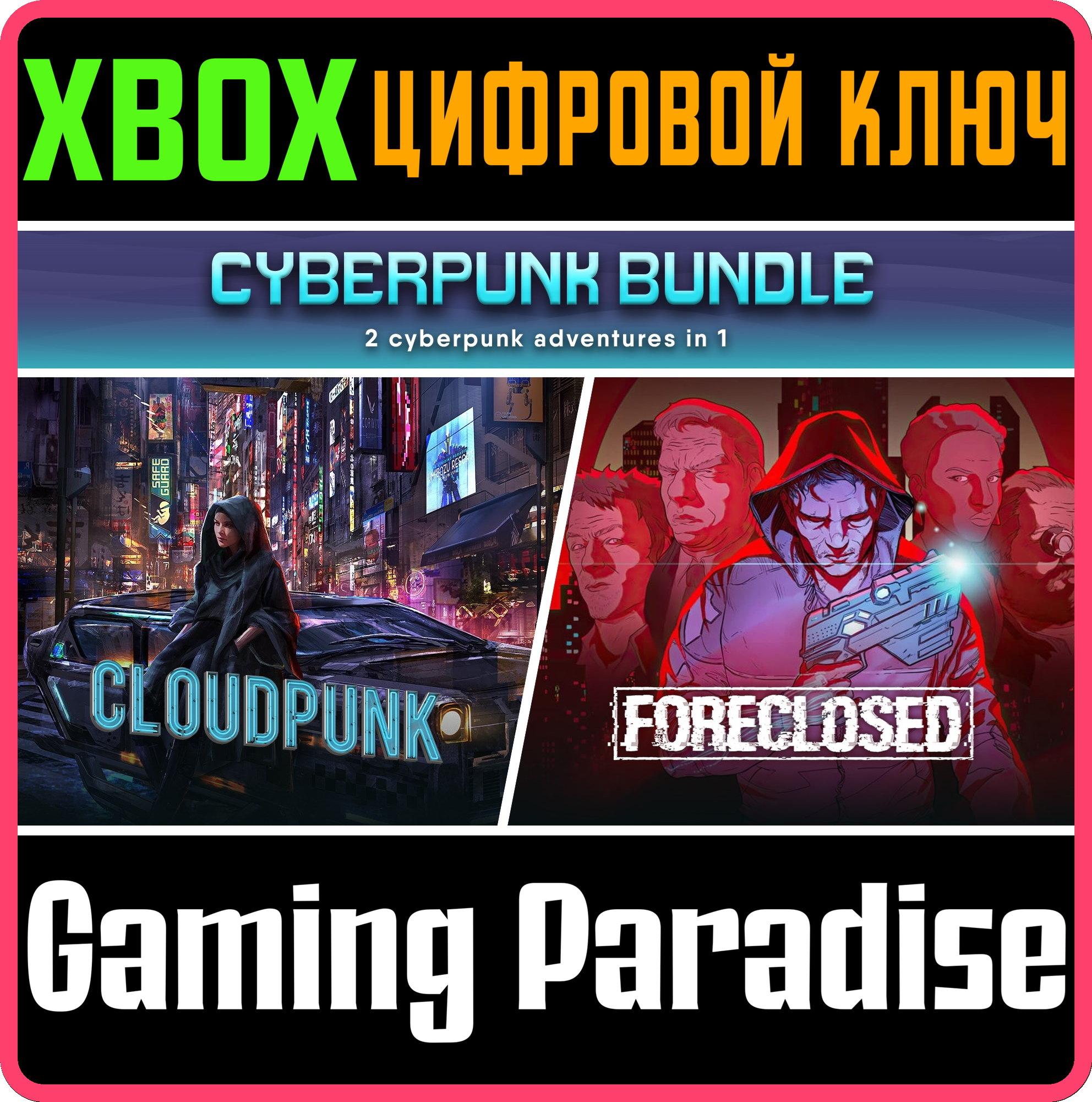 📜Подробное описание товара: Вас ждут два уникальных приключения в стиле киберпанк. Развозите товары по залитому неоном дождливому мегаполису и станьте частью нуарной истории в Cloudpunk. Или же раскройте коварный заговор в экшене FORECLOSED, полном интриг и экспериментальных аугментаций.