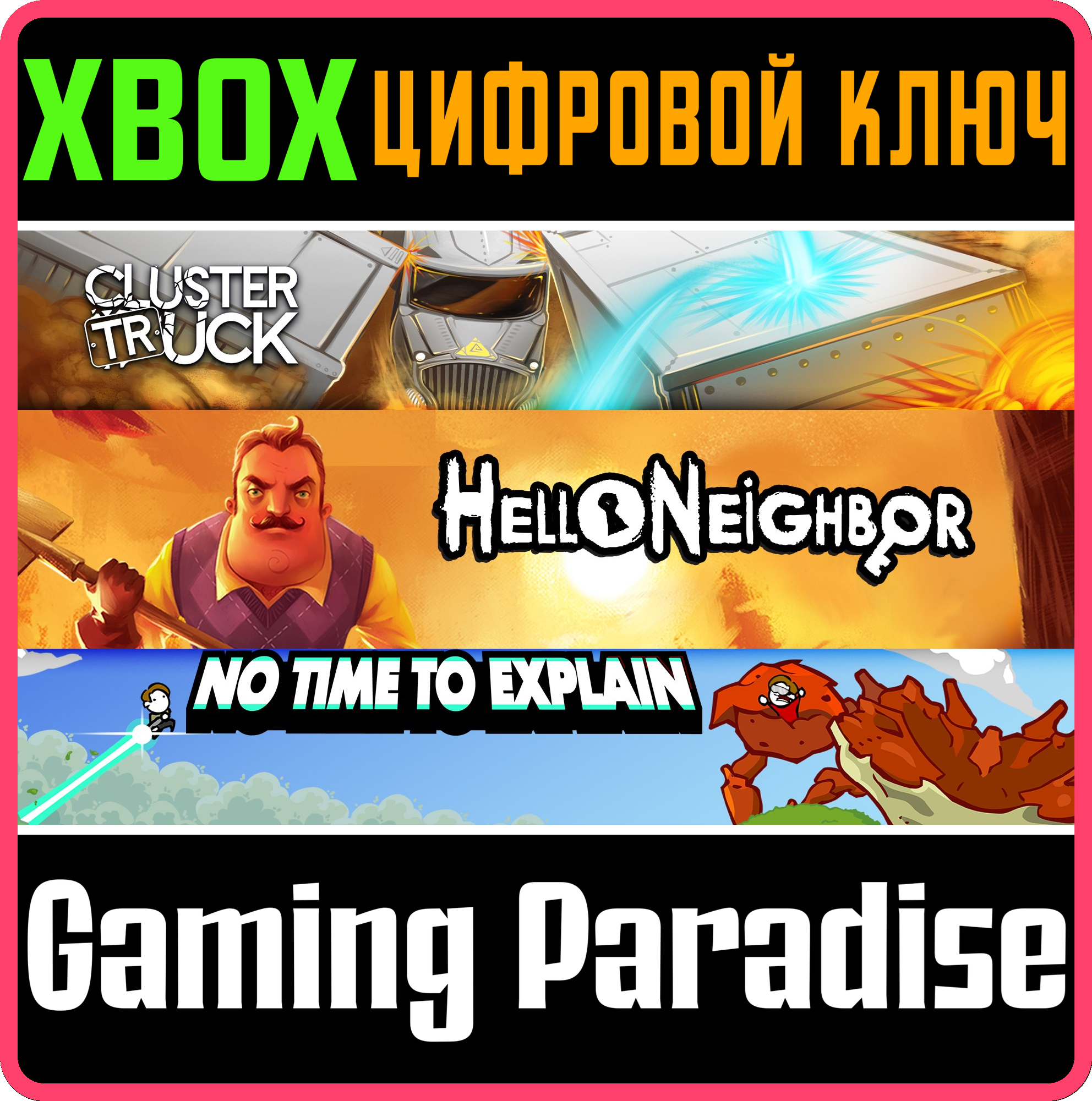 📜Подробное описание товара: О, да это же новый набор игр от tinyBuild! Пробраться в полный ужасов дом (Hello Neighbor), пронестись на полной скорости сквозь массовые аварии (Clustertruck) и пострелять из ракетницы для путешествий во времени (No Time To Explain) — вот это называется здорово и круто!