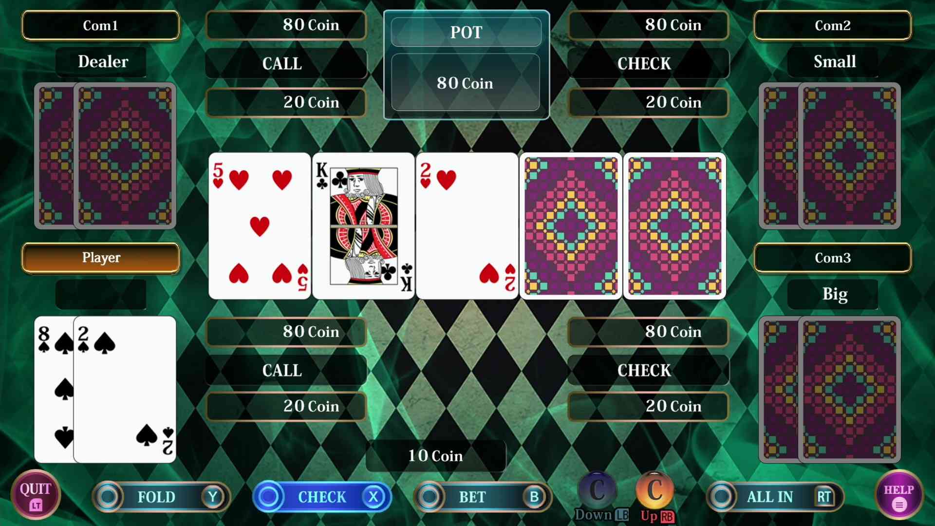 Two-player Mahjong・three-player Mahjong (Standard/Kansai/Kyoto rule sets)・Four-player Mahjong・Othello・Go・Shogi・Tsume Shogi・Hanafuda Koikoi・3-player Hanafuda・Texas Hold ´em・Blackjack・Five Card Draw Poker・Chase・ Backgammont・Shisen Mahjong Solitaire