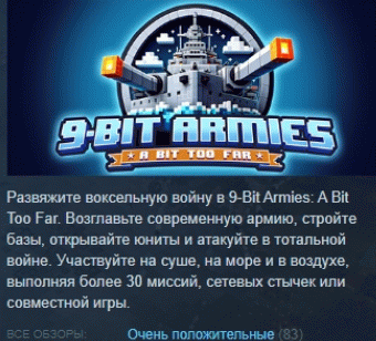 Ветераны стратегий в реальном времени Petroglyph представляют 9-Bit Armies: A Bit Too Far продолжение их триумфальной 8-битной серии игр. В 9-Bit Armies объединяйте свои военные силы на различных полях сражений и реализуйте свою стратегию на суше, на море и в воздухе. Размещайте своих воздушно-десантных солдат, разрушайте мосты и цельтесь из супероружия в новом виде пиксельной пиромании. Независимо от того, являетесь ли вы новичком в стратегических военных играх в реальном времени или опытным командиром, 9-Bit Armies подарит вам дополнительное удовольствие.