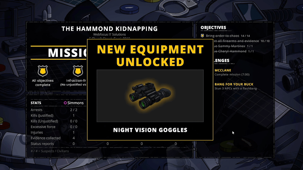 • Испытайте себя: как быстро вы способны оценить обстановку? Найдите наилучшую стратегию, чтобы задержать всех подозреваемых и вывести заложников — и членов своей команды — в целости и сохранности. Задание считается пройденным идеально, только если у вас не было ни одной травмы или потери.