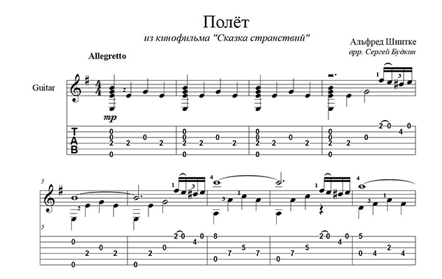 Аранжировка для гитары мелодии Альфреда Шнитке "Полёт" из кинофильма "Сказка странствий".