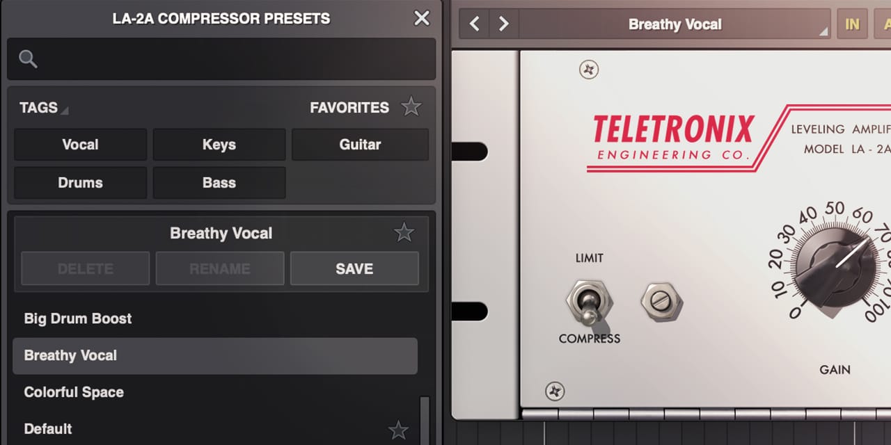 Даже если вы не профессиональный микшер, интуитивно понятные элементы управления LA-2A Tube Compressor позволят вам быстро добиться нужного звучания, чтобы каждый раз идеально выстраивать треки в миксе. А благодаря профессионально разработанным пресетам для вокала, гитар, баса и т. д. в ваших работах будет использована та же мягкая ламповая компрессия, которую можно услышать в более чем 50-летней популярной музыке.