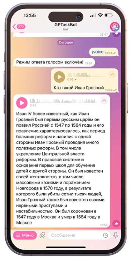 Максимально удобный доступ к Chat GPT 4 через Telegram. Стоит один раз попробовать и вы больше не захотите использовать его в другом формате. Абсолютно все функции перенесены и адаптированы.