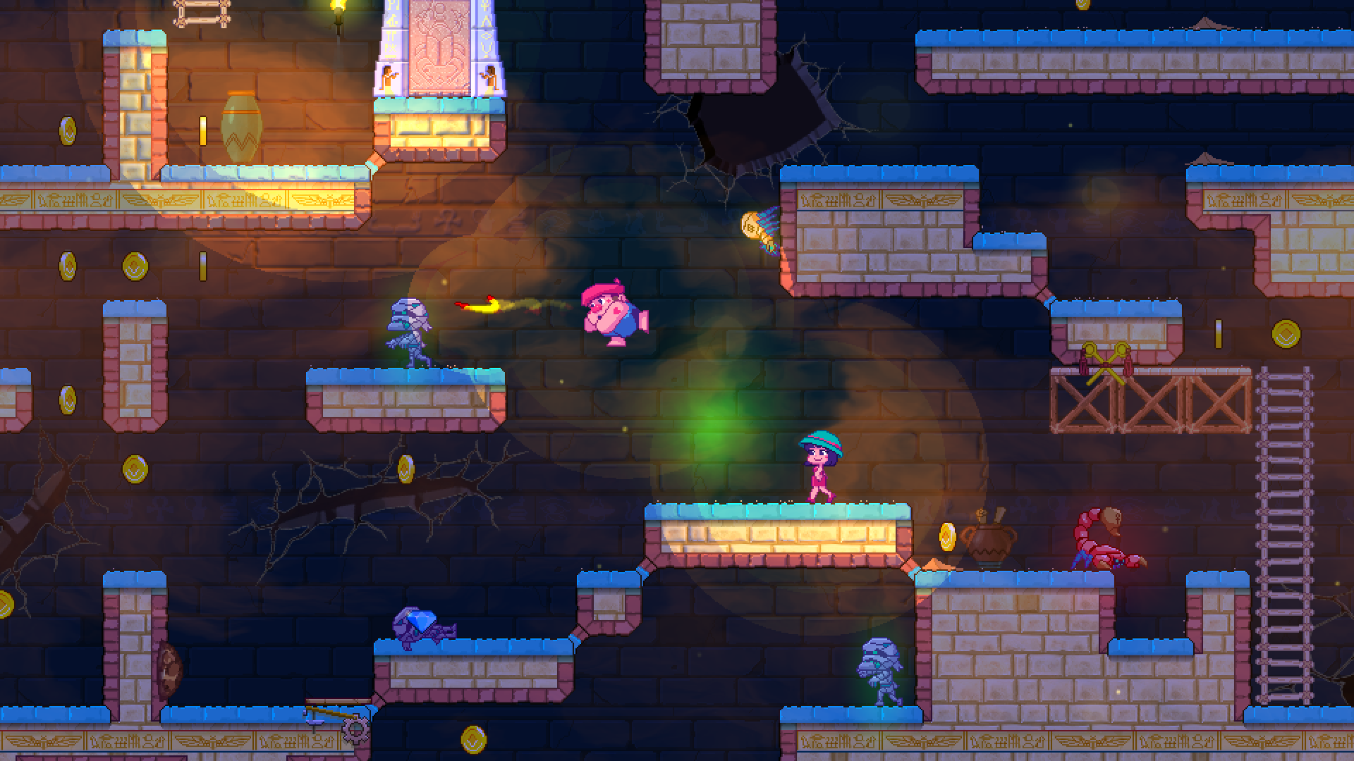 Играйте за Джорджио или Фелисию в одиночном или кооперативном режиме, либо против друг друга. Легко переключайтесь между персонажами, чтобы использовать их уникальные способности.