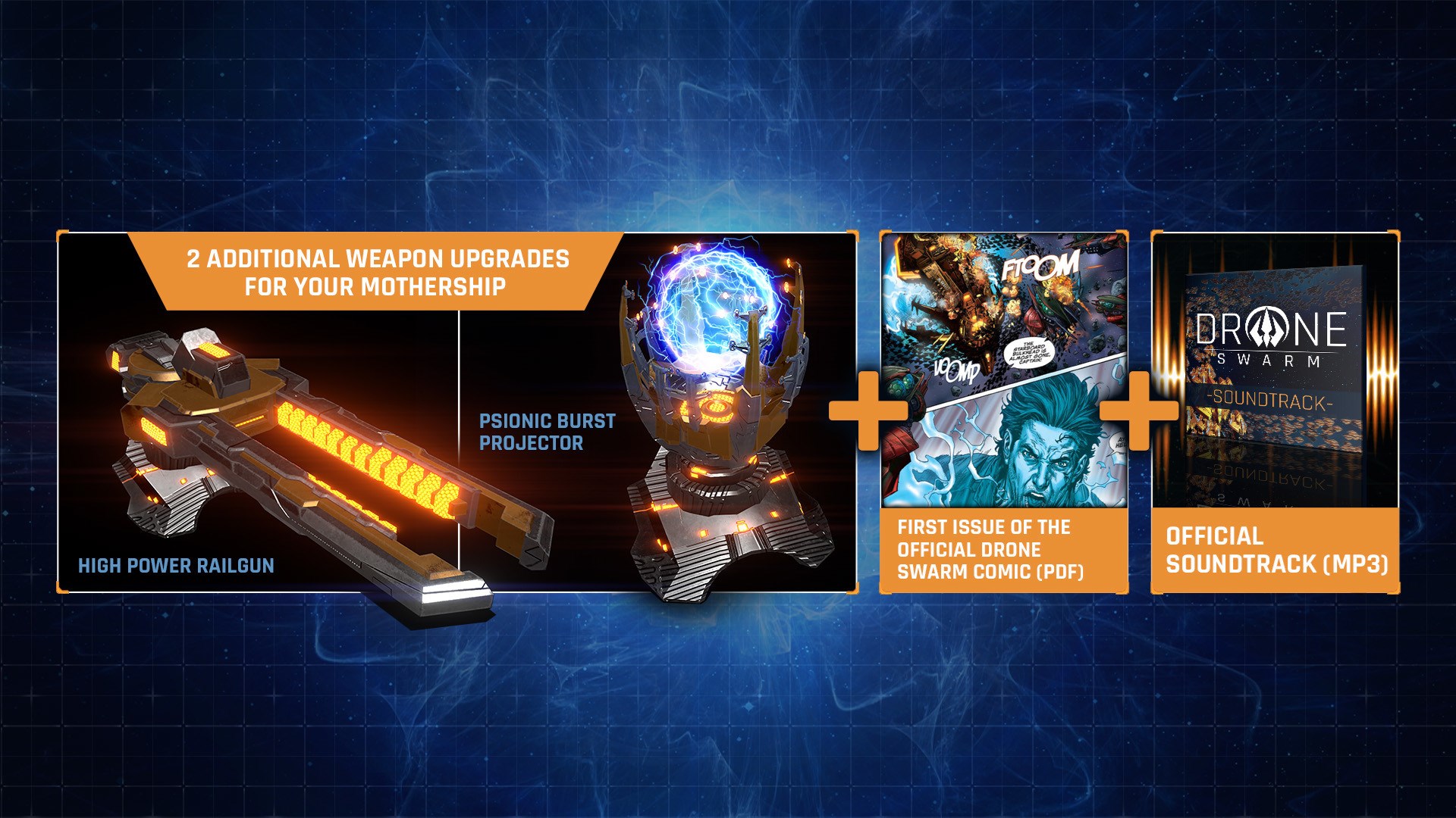 Получите множество дополнительных материалов для Drone Swarm, улучшив основную игру до версии DeluxeОткройте для себя официальное улучшение до версии Deluxe, добавляющее в игру новые материалыВ улучшение до версии Deluxe входят: Официальный саундтрек в цифровом формате: Все композиции из Drone Swarm от Only Sound в формате mp3. 2. Официальный цифровой комикс по Drone Swarm, созданный при участии 451 Media Group Майкла Бэя: Ознакомьтесь с первым цифровым выпуском официального комикса по Drone Swarm, созданного при участии 451 Media Group Майкла Бэя. Комикс предоставляется в формате pdf. Последующие выпуски будут публиковаться в бумажном виде. 3. Материально-энергетический рельсотрон Добавляет на корабль улучшение «Материально-энергетический рельсотрон». UMF удалось получить прототип довоенного оружия, а инженеры «Арго» установили его на корабль и подключили к главному реактору. Снаряд из сплава, используемого для изготовления корпусов дронов, при выходе из ствола развивает почти световую скорость и летит к цели в материально-энергетическом состоянии. При попадании оставшаяся материя мгновенно преобразуется в энергию и наносит разрушительный урон. 4. Проектор псионного импульсаДобавляет на корабль улучшение «Проектор псионного импульса». С самого своего основания Орден работал над технологиями, которые позволяют усилить — и обратить в оружие — псионную силу. Проектор псионного импульса — это прототип умного оружия, которое преобразует псионную силу в мощный импульс. Поразив первую цель направленной телекинетической энергией, импульс продолжает самостоятельно искать дополнительных врагов. Оружие было запрещено на Земле, но Орден посчитал, что оно может пригодится «Арго» в случае, если кораблю окажут сопротивление.
