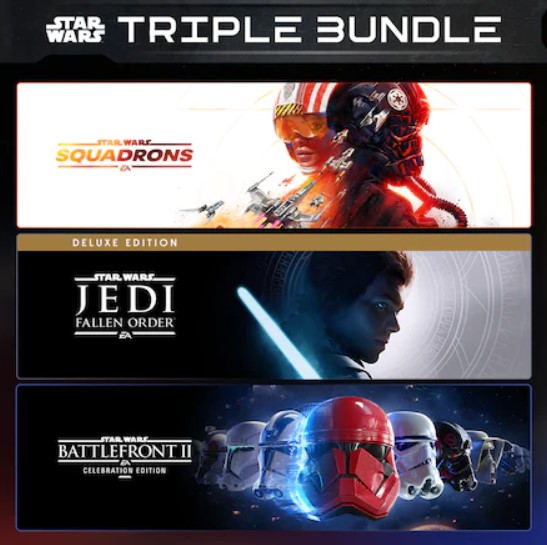 "Три получившие отличные отзывы критиков игры в составе тройного комплекта EA STAR WARS™, который включает STAR WARS™: Squadrons, «ЗВЁЗДНЫЕ ВОЙНЫ Джедаи: Павший Орден™ — издание Deluxe» и «STAR WARS™ Battlefront™ II: Праздничное издание».