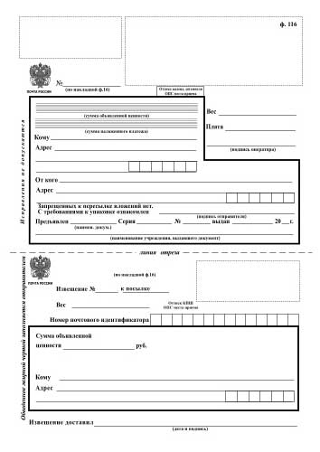Бланк почты России ф116 (cопроводительный адрес к посылке).