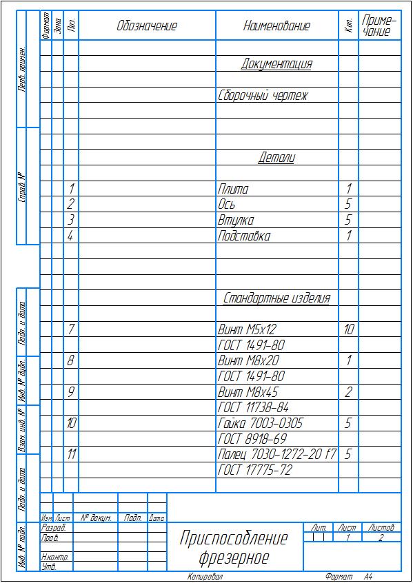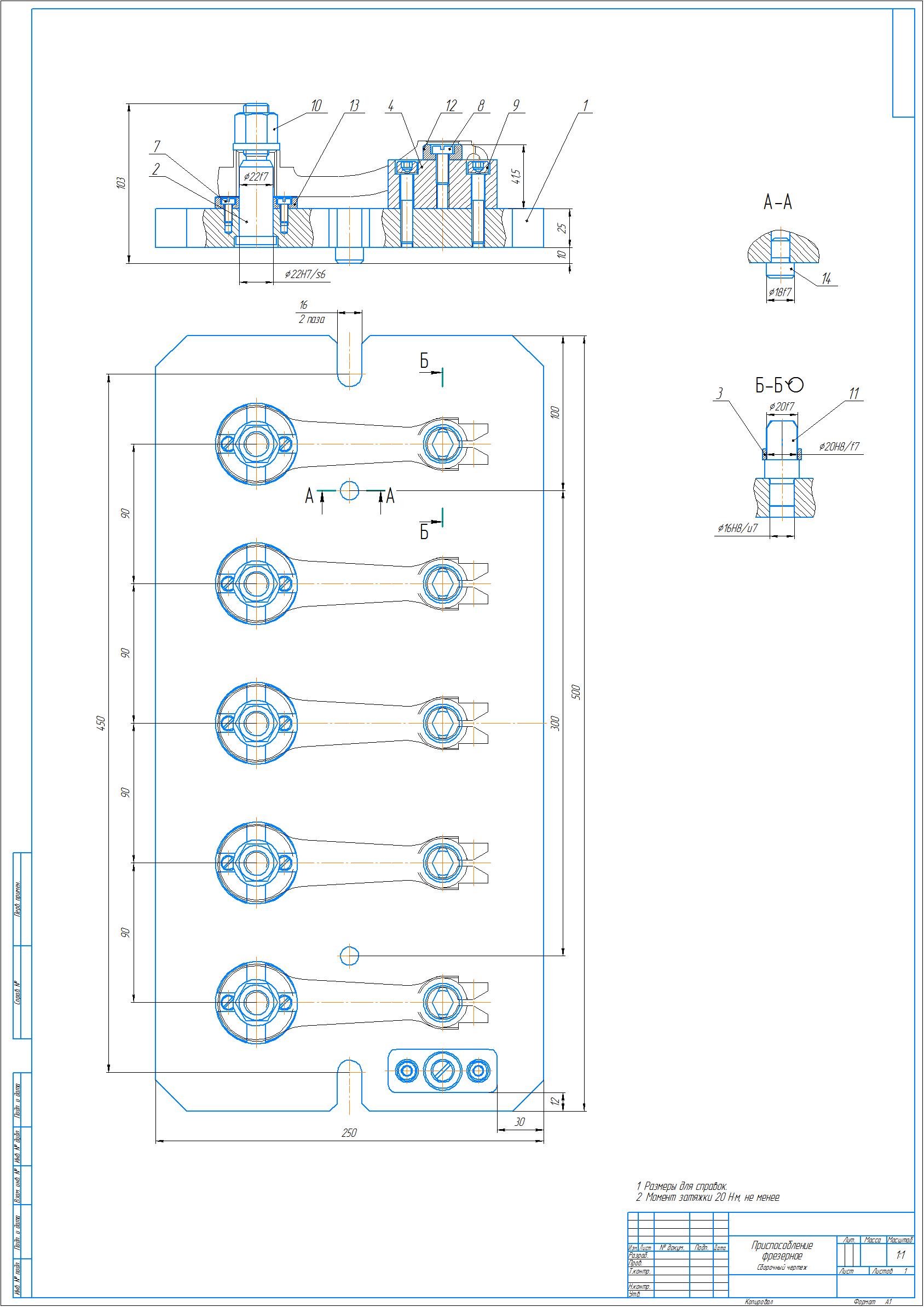Сборочный чертеж и спецификация станочного многоместного приспособления для фрезерования детали "Рычаг"