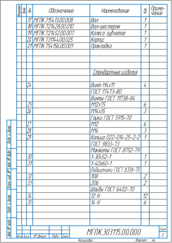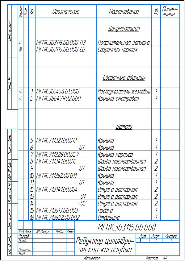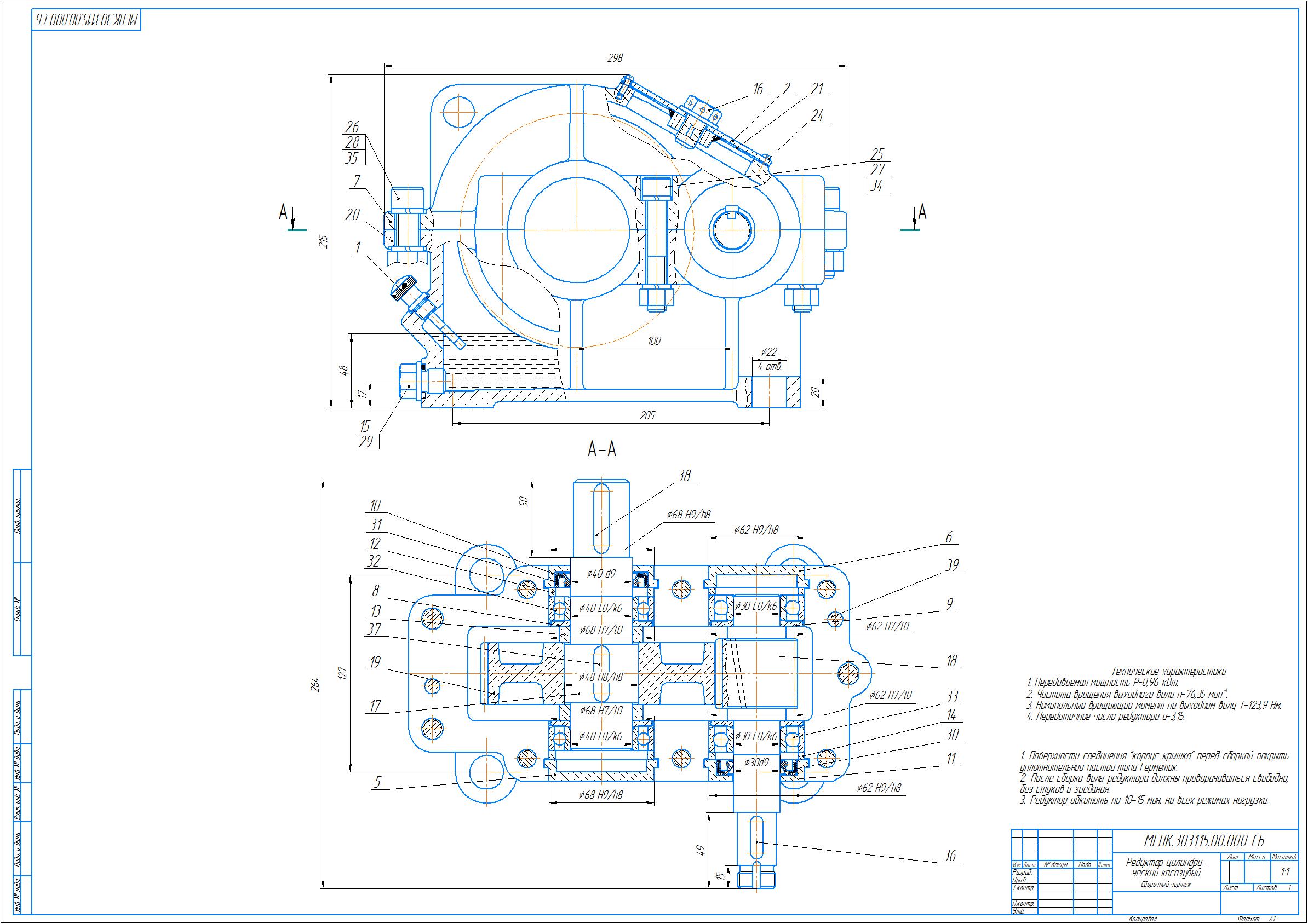 Редуктор цилиндрический косозубый. Сборочный чертеж и спецификация в компасе. Также деталировка в виде вала и зубчатого колеса. Межосевое расстояние - 100 мм, модуль - 2 мм, передаточное отношение u=3,15
