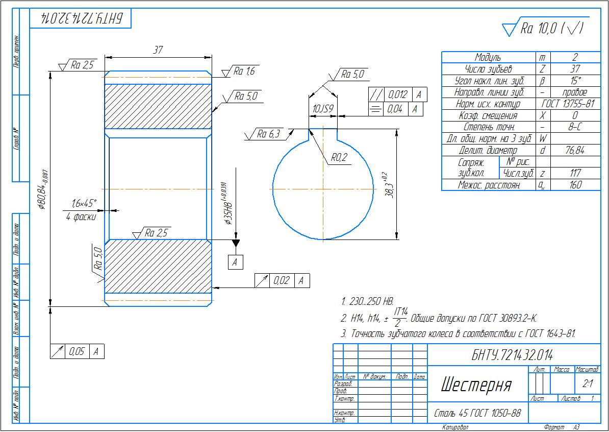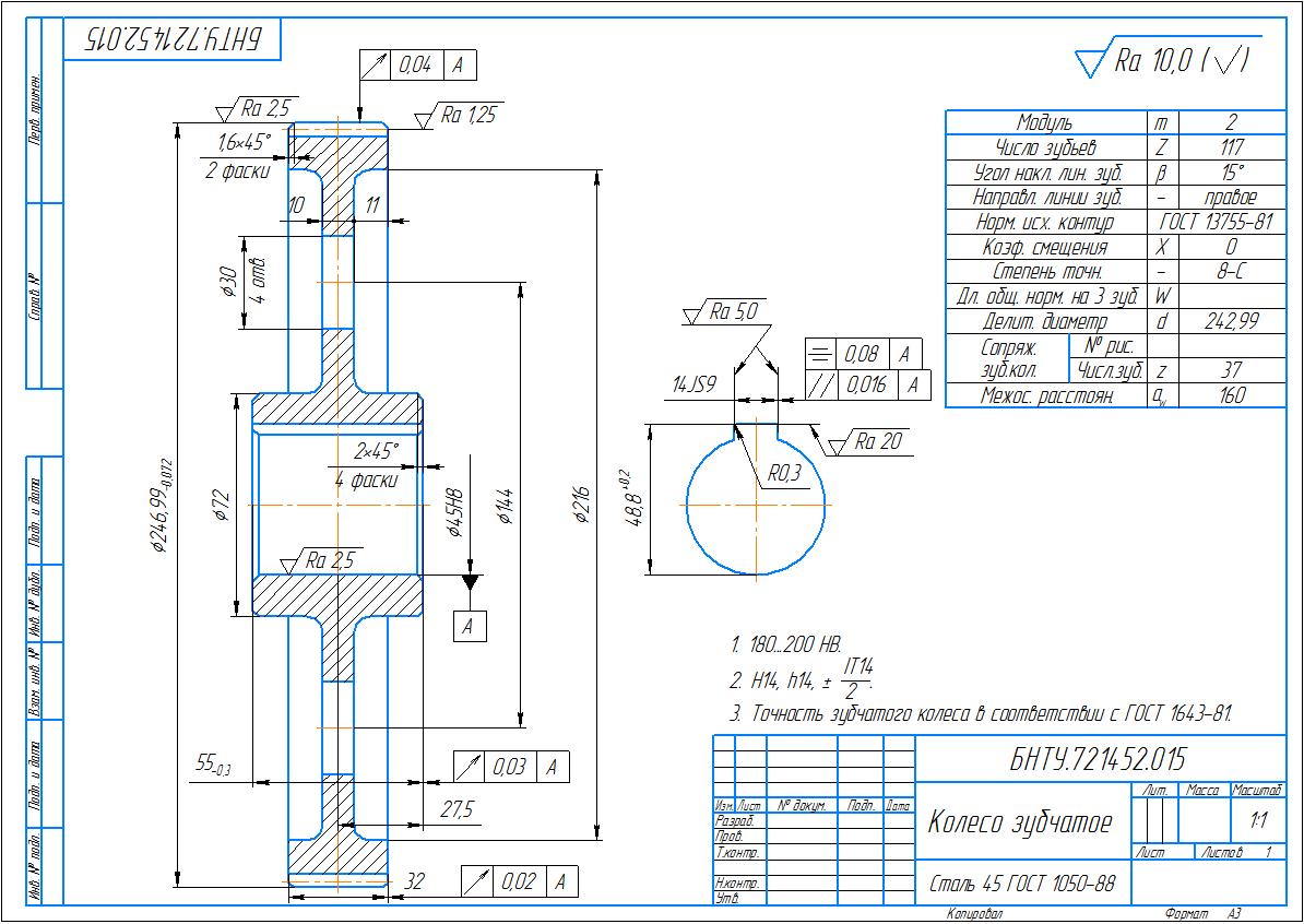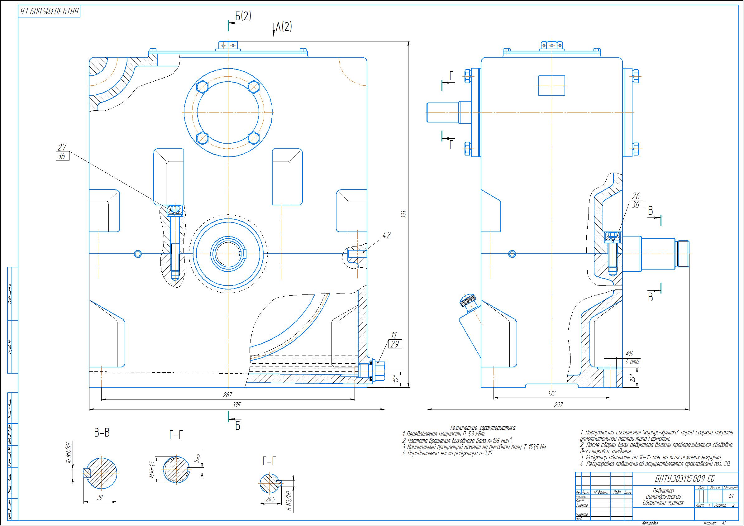 Редуктор цилиндрический косозубый вертикальный. Сборочный чертеж, спецификация, деталировочные чертежи вала, звездочки, зубчатого колеса, шестерни. Межосевое расстояние: 160 мм, модуль 2 мм, передаточное отношение u=3,15. Чертежи выполнены в программе Компас.