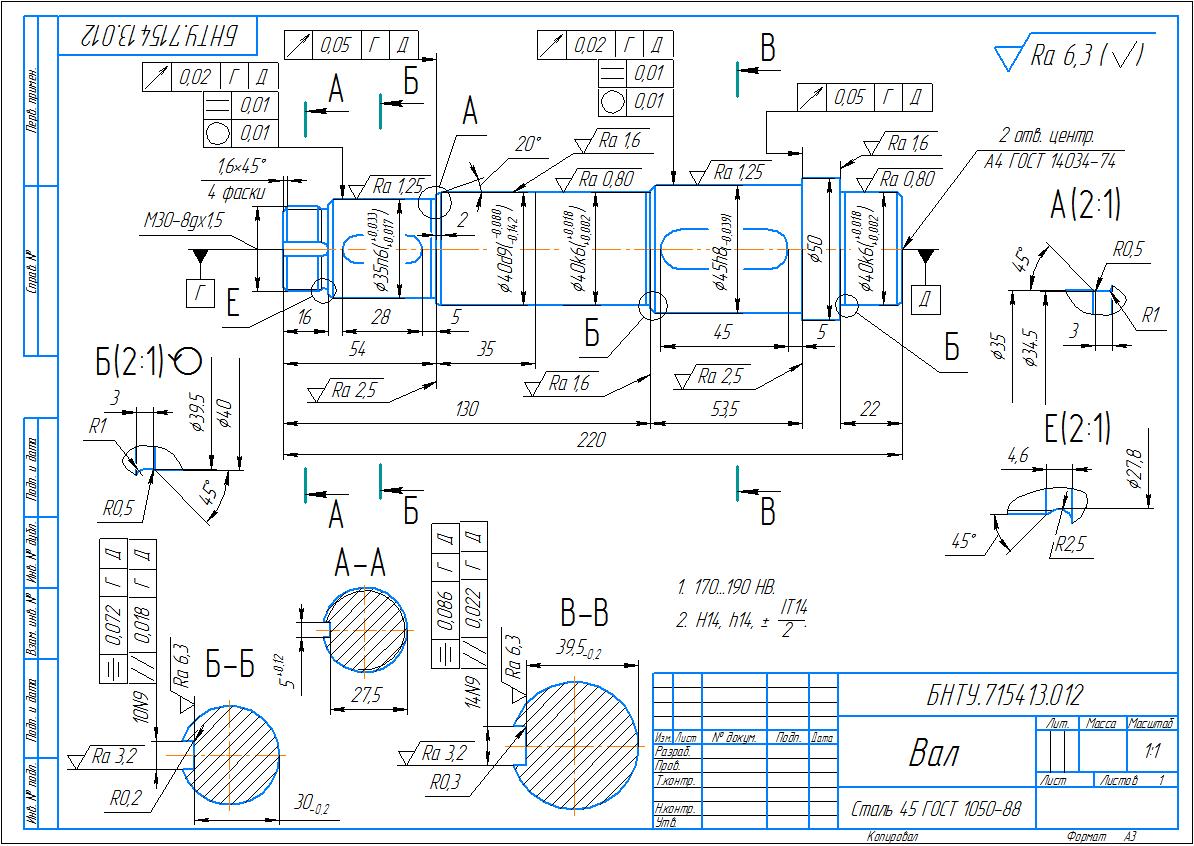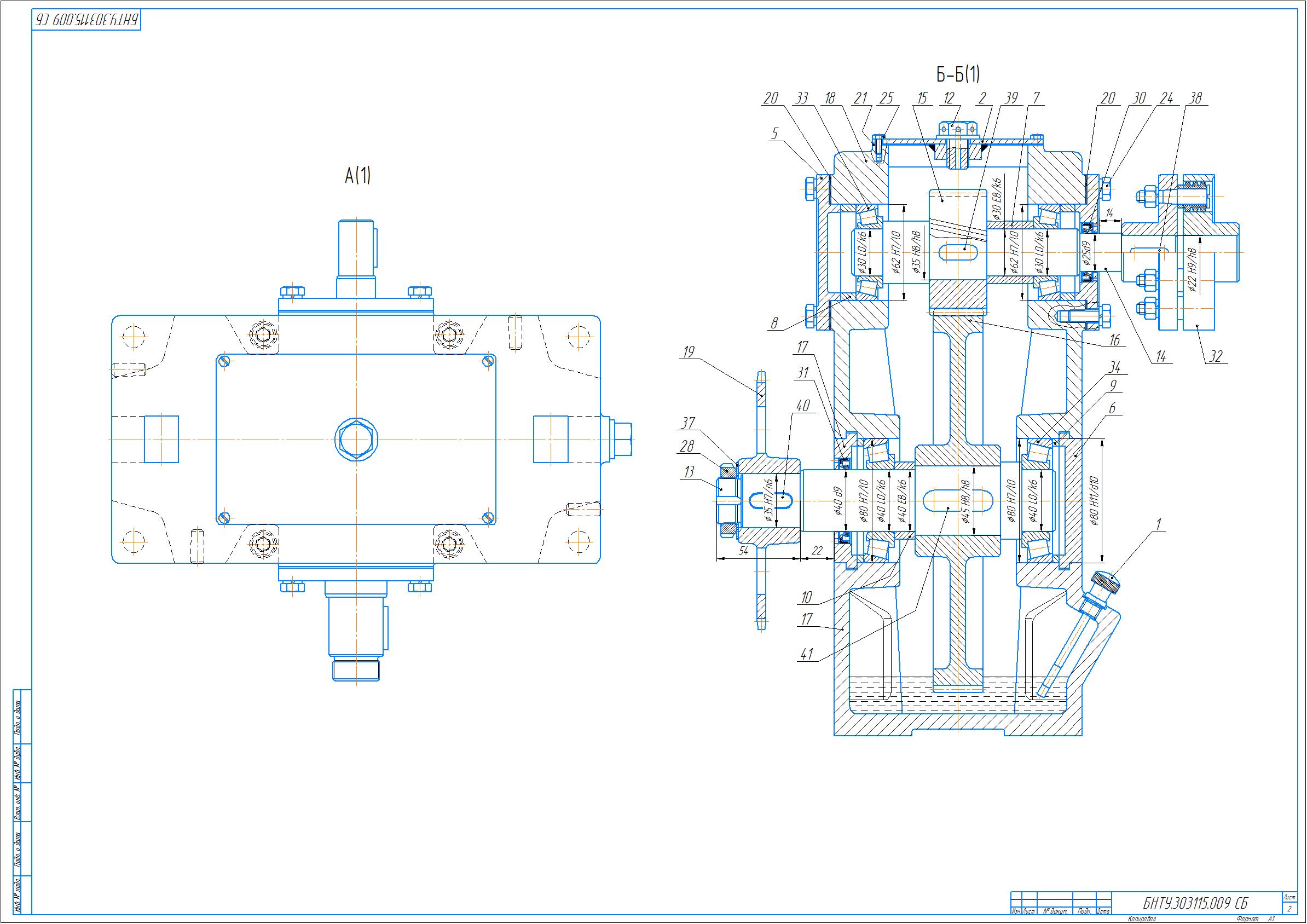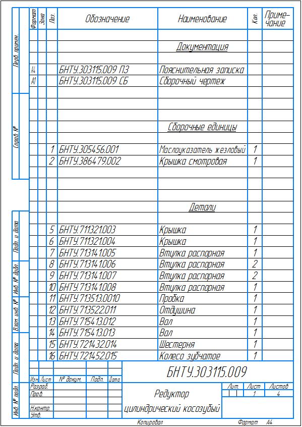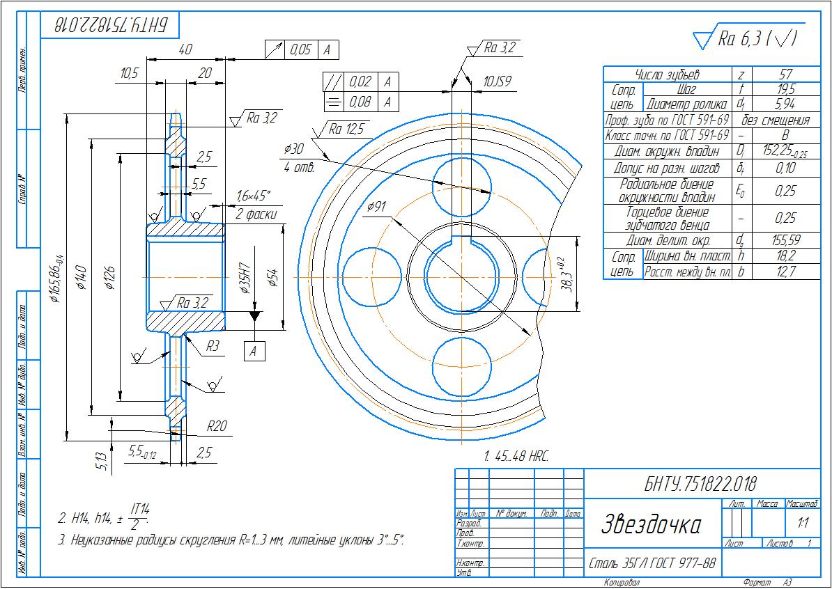 Редуктор цилиндрический косозубый вертикальный. Сборочный чертеж, спецификация, деталировочные чертежи вала, звездочки, зубчатого колеса, шестерни. Межосевое расстояние: 160 мм, модуль 2 мм, передаточное отношение u=3,15. Чертежи выполнены в программе Компас.