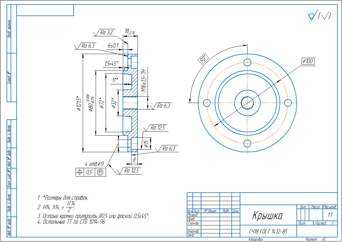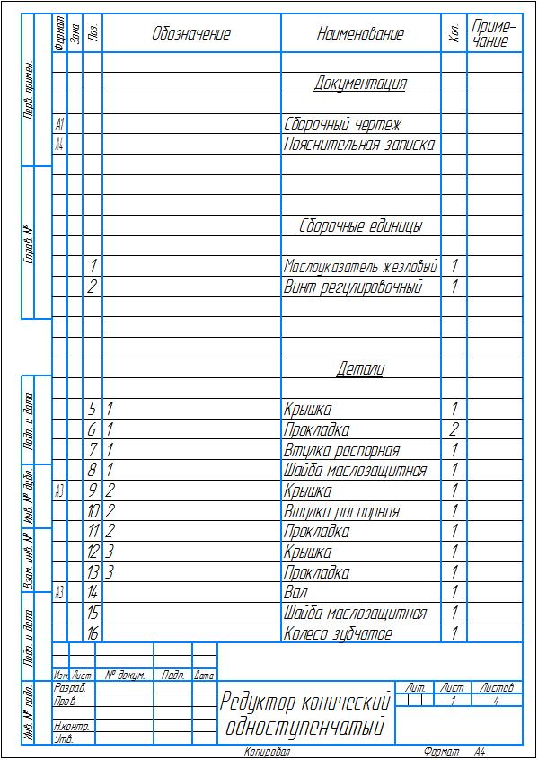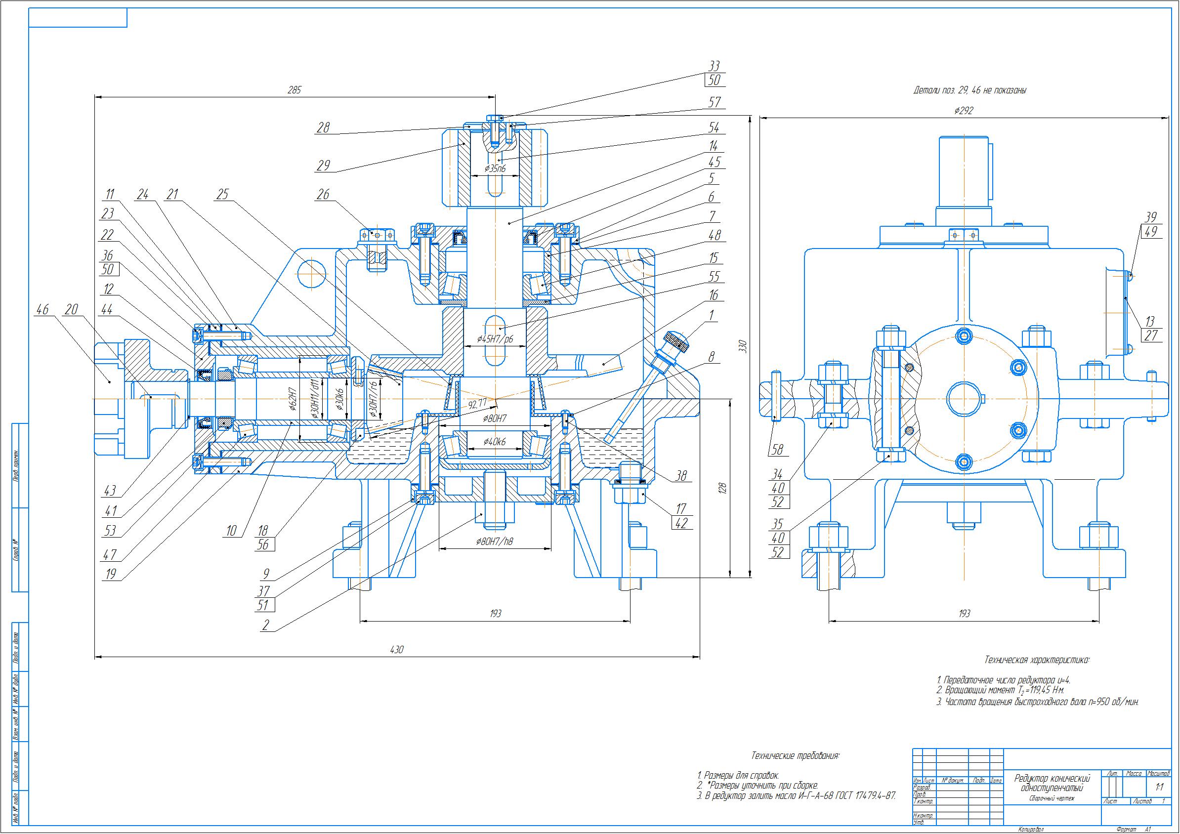Сборочный чертеж и спецификация редуктора конического одноступенчатого вертикального в компасе, передаточное отношение равно 4. Также в архиве находятся чертеж крышки и вала. Все чертежи и спецификация выполнены в компасе.