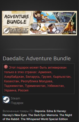 Включенные товары (5): Deponia, Edna & Harvey: Harvey´s New Eyes, The Dark Eye: Memoria, The Night of the Rabbit, The Whispered World Special Edition