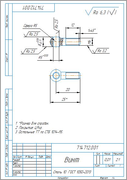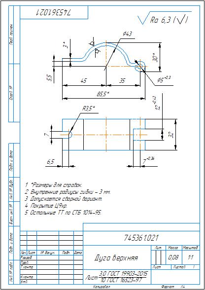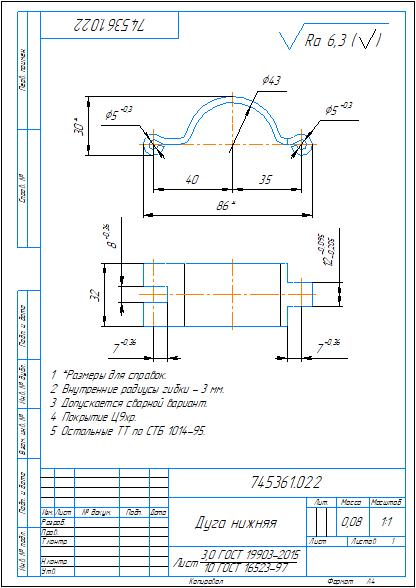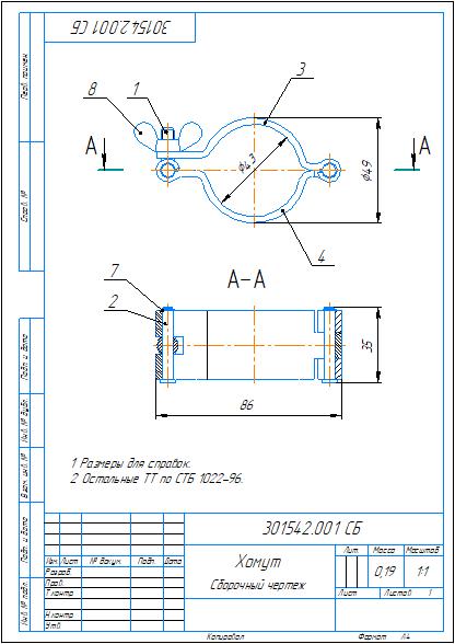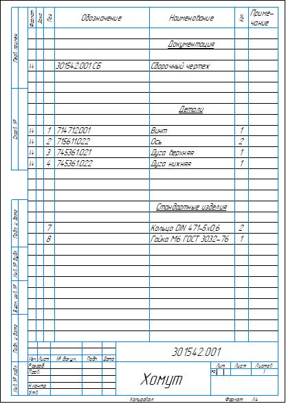 Комплект конструкторской документации на сборочную единицу хомут в составе: спецификация, сборочный чертеж, рабочие чертежи входящих деталей. Все чертежи и спецификация выполнены в компасе.