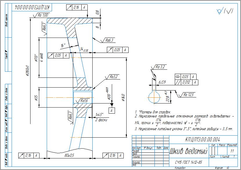 Шкив плоскоременной передачи в компасе. Наружный диаметр шкива - 280 мм, диаметр посадочного отверстия - 20 мм.