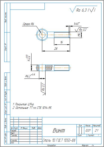 Рабочий чертеж детали винт с проушиной в компасе. Резьба М6