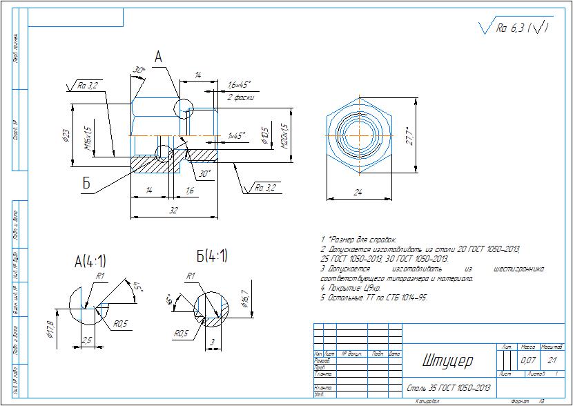 Рабочий чертеж детали штуцер в компасе. Присоединительные размеры: наружная метрическая резьба М20х1,5 мм; внутренняя метрическая резьба М16х1,5 мм
