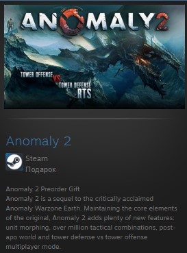 Anomaly 2 — это продолжение получившей признание критиков Anomaly Warzone Earth. Сохраняя основные элементы оригинала, Anomaly 2 добавляет множество новых функций: морфинг юнитов, более миллиона тактических комбинаций, мир после апокалипсиса и многопользовательский режим Tower Defense vs Tower Attack.