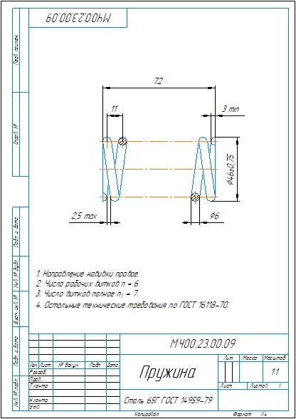 Рабочий чертеж детали пружина МЧ00.23.00.09 в компасе из сборки МЧ00.23.00.00 сборника по деталированию Боголюбова