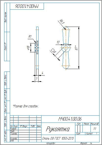 Рабочий чертеж детали рукоятка МЧ00.41.00.06 в компасе из сборки МЧ00.41.00.00 альбома по деталированию Боголюбова
